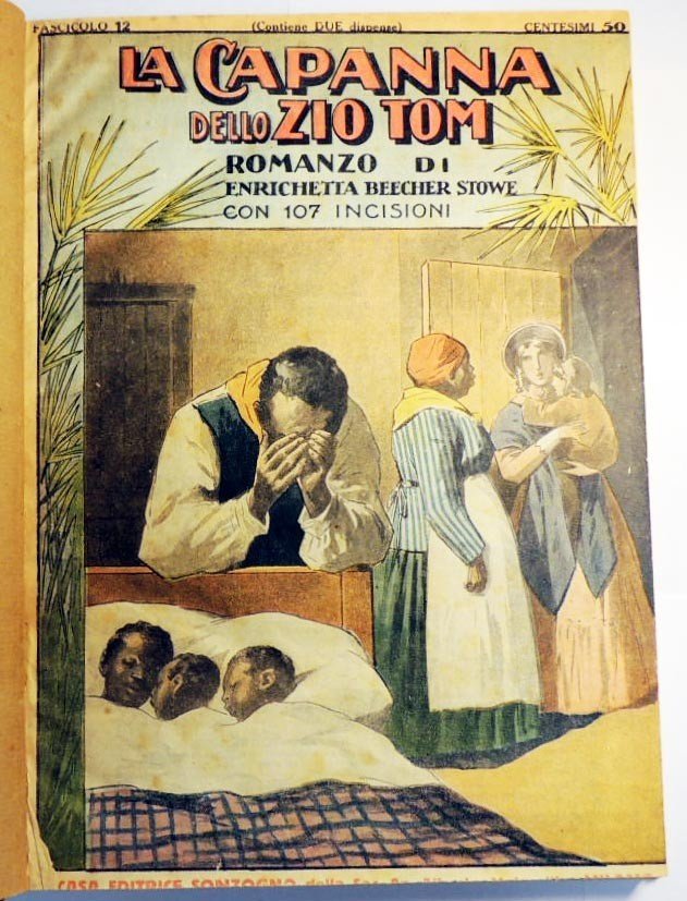 Enrichetta Beecher Stowe, La capanna dello zio Tom, illustrata da 107 finissime incisioni, nuova versione italiana di Palmiro Premoli, Casa Editrice Sonzogno, Milano s.d. (ma primi '900), pp. 278, ill. b.n., cm 29, legatura in tela con copertine applicate ai piatti e al dorso. Leggere tracce d'uso alla legatura con qualche segnetto di biro rossa, un piccolo residuo di nastro adesivo al margine interno del piatto anteriore e della prima pagina di guardia, minime fioriture, ma nel complesso ancora buon esemplare.