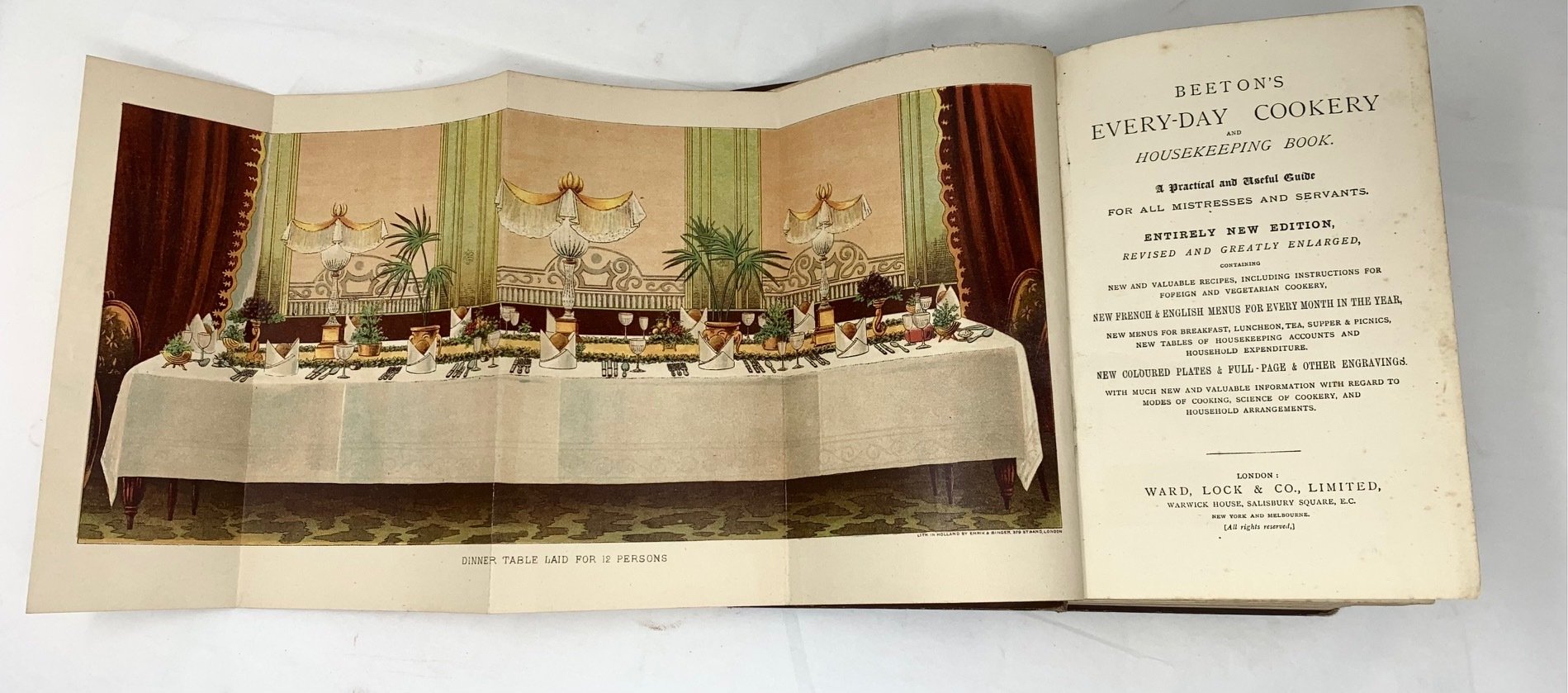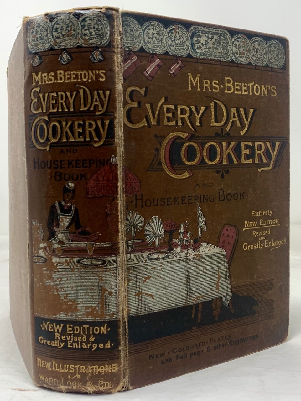 >in-8, pp. LXXXII, 568, con centinaia di illustrazioni in silogr. n.t., 8 belle cromolitografie (tra cui una tavola apparecchiata, ripieg. in antiporta) e 26 tavole in silogr. Bella legatura edit. in tela figurata in oro e a colori, con piatti, boccali e scena di apparecchiatura al piatto ant. e al dorso (qualche traccia d'uso al dorso). Edizione riveduta ed ampliata di importante opera illustrata che spiega ogni mansione che i servitori e le governanti dovevano padroneggiare per mandare avanti una magione, per poi elencare, sotto forma di dizionario, oltre un migliaio di ricette e preparazioni diverse; il tutto ornato da graziose tavole a colori e vignette in bianco nero in ciascuna pagina. Buon esemplare. Bitting, p. 32 (prima ed.)