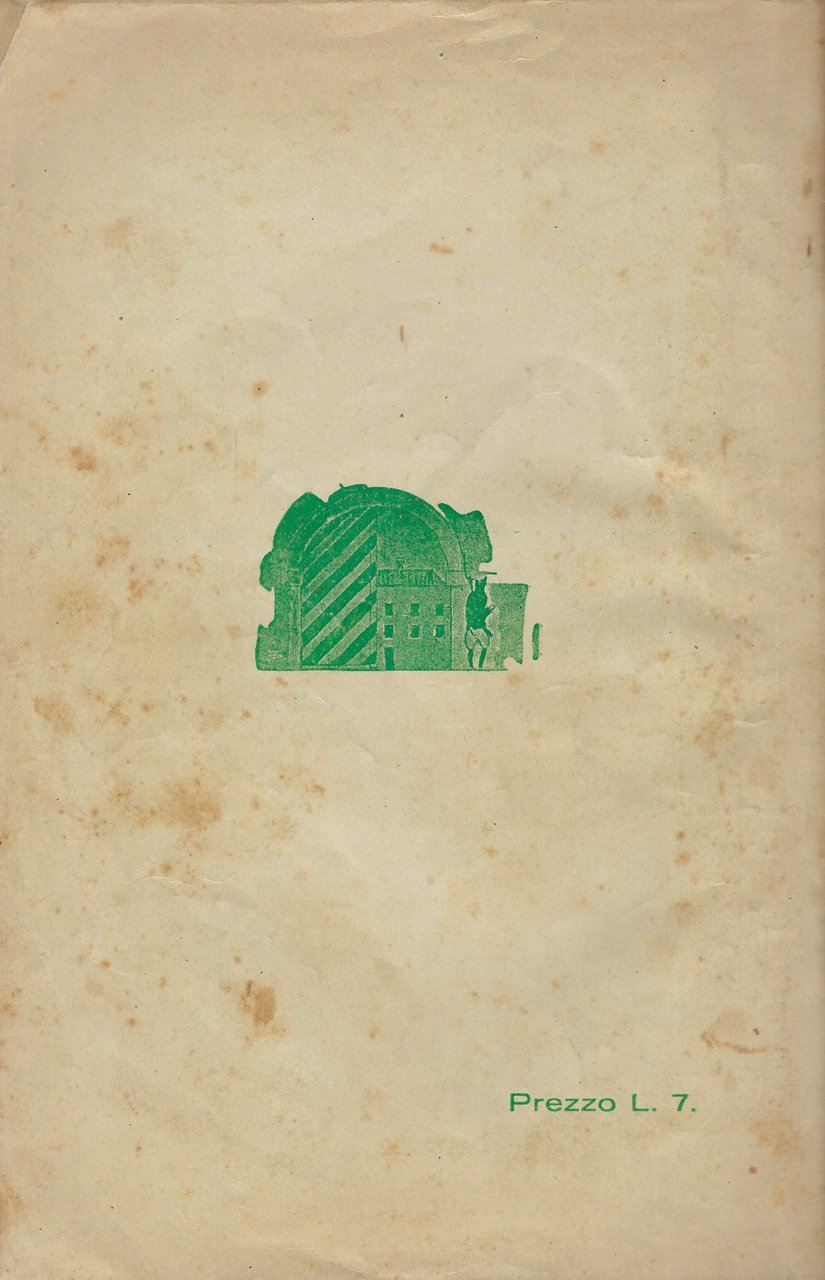 Brossura editoriale decorata al piatto anteriore. Presenta pieghe, uno strappo al dorso e qualche brunitura alla 4° di copertina.