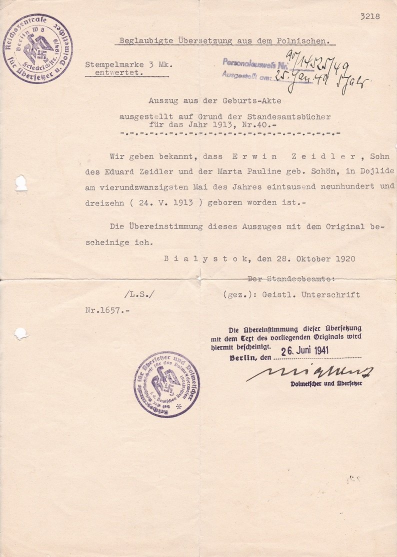Das Dokument beinhaltet scheinbar die beglaubigte Übersetzung eines Geburtsurkundenauszugs eines Mannes der in Bialystok geboren wurde. Beglaubigt wurde die Übereinstimmung der hier vorliegenden deutschen Übersetzung mit dem Original in polnischer Sprache, und damit die deutsche (und nicht polnische) Abstammung des betroffenen Mannes. Das Blatt trägt zwei Stempel der Reichszentrale für Übersetzer und Dolmetscher, wurde datiert und signiert. Am oberen Rand befindet sich ein weiterer Eintrag, scheinbar aus späterer Zeit. Das Blatt hat das Wasserzeichen von Manila Schreibmaschinenpapier. Die Beglaubigung stammt aus dem Sommer 1941, was sie zeitgenössisch möglicherweise zu einem überaus wichtigen Dokument gemacht hat.