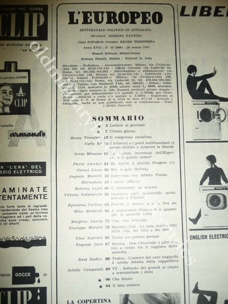DESCRIZIONE: L'EUROPEO 26 marzo 1961 n. 13 Vari articoli fra cui quelli citati nel titolo. Indice completo della rivista in foto a fine inserzione. CONDIZIONI DELL'OGGETTO: Buone/Ottime pagine centrali staccate dal corpo della rivista. PESO/WEIGHT: 320 g without package