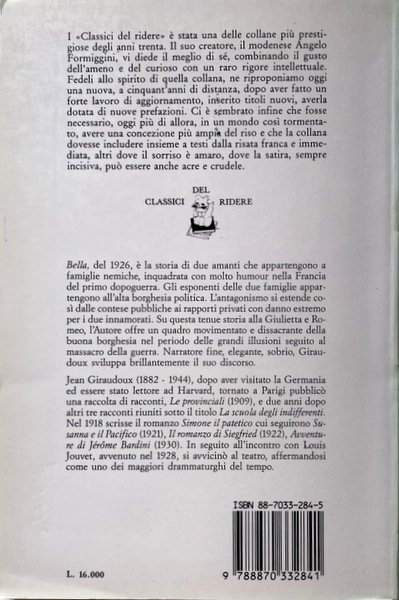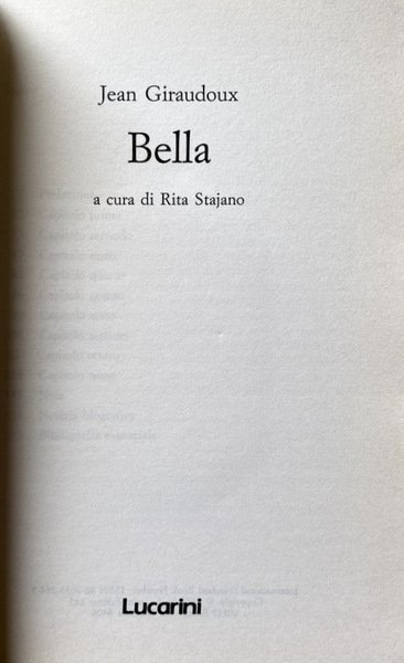 Bella, del 1926, è la storia di due amanti che appartengono a famiglie nemiche, inquadrata con molto humour nella Francia del primo dopoguerra. Gli esponenti delle due famiglie appartengono all'alta borghesia politica. L'antagonismo si estende così dalle contese pubbliche ai rapporti privati con danno estremo per i due innamorati. Su questa tenue storia alla Giulietta e Romeo, l'Autore offre un quadro movimentato e dissacrante della buona borghesia nel periodo delle grandi illusioni seguito al massacro della guerra. Narratore fine, elegante, sobrio, Giraudoux sviluppa brillantemente il suo discorso.
