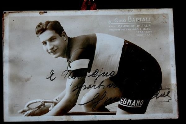 14×9 cm; bellissima foto con dedica autografa del grande ciclista Gino Bartali (Ponte a Ema, frazione di Bagno di Ripoli e Firenze 18 luglio 1914 Firenze 5 maggio 2000). La foto al verso presenta una piccola antica striscia di tessuto montata ad occhietto per permettere di appendere la stessa. La foto presenta una didascalia a stampa Gino Bartali, Campione dItalia, Vincitore del XXIV Giro dItalia, 1936 XIV°, 1937 XV°. La foto, in buone condizioni di conservazione, presenta un Bartali con i pantaloncini della squadra Legnano alla quale aderì nel 1936. La foto è sicuramente scattata nel 1937 quando Bartali aveva appena 23 anni ma si era già affermato come il ciclista italiano più forte dellepoca, infatti non riporta ancora la vittoria di Bartali al Tour de France ottenuta nel 1938. Le foto con dedica di Bartali risalenti a prima della Seconda Guerra Mondiale, probabilmente anche a causa delle note vicende politiche italiane che videro il grande corridore contrapposto al Regime Fascista, non sono comuni.
