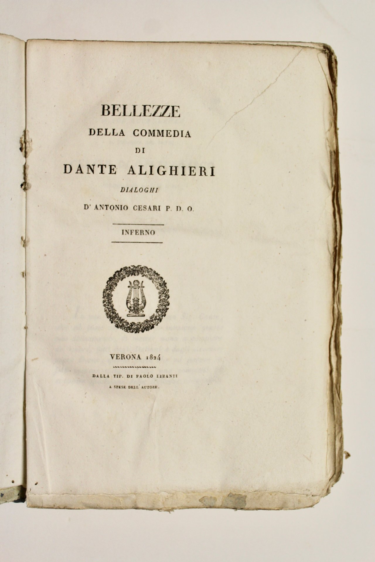 4 voll. in 8° (mm 235x160) Pagg. XIV, 666 - VIII, 604 - 648, il IV vol.di pagg. 178 comprende l'indice generale delle cose notabili di tutta l'opera. Dedica al conte Cesare di Castelbarco. Brossura editoriale muta con titolo manoscritto al dorso. L'opera si svolge in forma di dialogo fra tre appassionati lettori che commentano le terzine piu' belle dell'opera dantesca. Bell'esemplare intonso, a pieni margini in barbe, genuino, stampato su carta forte. Presenta minime mende internamente come un piccolo tarlo, lievi fioriture al tomo dell'indice, un pò allentato il I vol. Legatura con tracce d'uso lievi.Mambelli, 138: " Vi è riprodotto l'intero poema, commentato a mezzo di un dialogo che si finge avvenuto fra Giuseppe Torricelli, Agostino Zeviani e Filippo Rosa Morando. Gamba, 407 - Dantesca n 100.