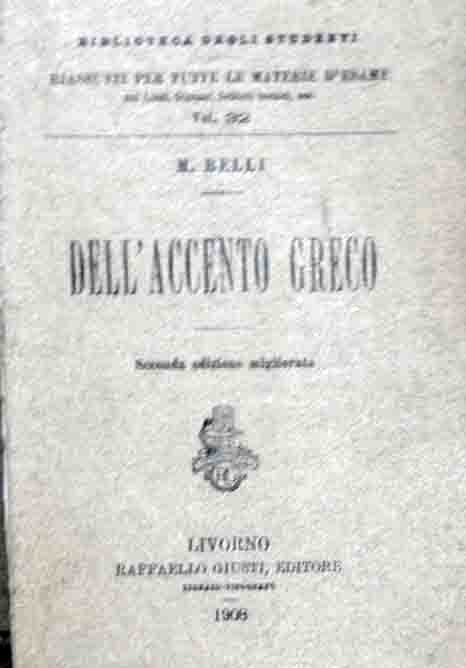Marco Belli, Dell’accento greco, Raffaello Giusti Editore Libraio-Tipografo, Livorno 1908, seconda ed. migliorata, pp. 47, cm 16, br. ed. Collana Biblioteca degli studenti. Riassunti per tutte le materie d’esame nei Licei, Ginnasi, Istituti Tecnici, ecc., n. 32. Firma d’appartenenza alla prima pagina. Leggere tracce d’uso, minime fioriture, carta lievemente brunita, per il resto ben conservato.