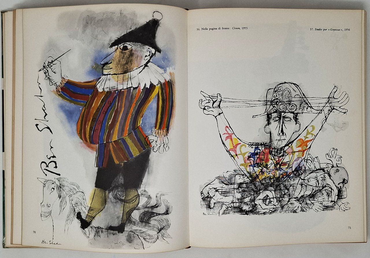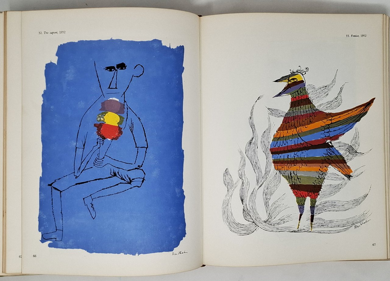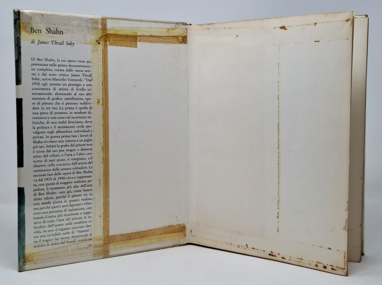 Lingua del testo: italiano. Traduzione di Maria Luisa Calderazzi Guicciardi e Francesco Luciano. Pagine: 252.Formato: 22 x 28,5 cm circa. Stato di conservazione: vistose macchie lasciate da dei pezzi di nastro adesivo (ancora presente) utilizzato per fissare una sovraccoperta trasparente di protezione alla copertina, qualche piccola macchia marrone sul margine inferiore delle due pagine frontali 238, 239, una striscia riportante un articolo di giornale (in lingua inglese) su Ben Shahn incollata (tramite della colla sul margine superiore della striscia) sulla penultima pagina bianca ma, nel complesso, un buon esemplare. Privo di scritte, sottolineature, timbri, firme d'appartenenza o altri segni nel testo. Copertina editoriale rigida con sovraccoperta illustrata a colori. Ben Shahn (1898-1969) è stato un pittore, fotografo e illustratore americano di origine lituana, noto per il suo impegno sociale e politico nell'arte. La sua opera combina uno stile figurativo distintivo con una forte attenzione ai temi della giustizia sociale, dei diritti umani e della dignità del lavoro.