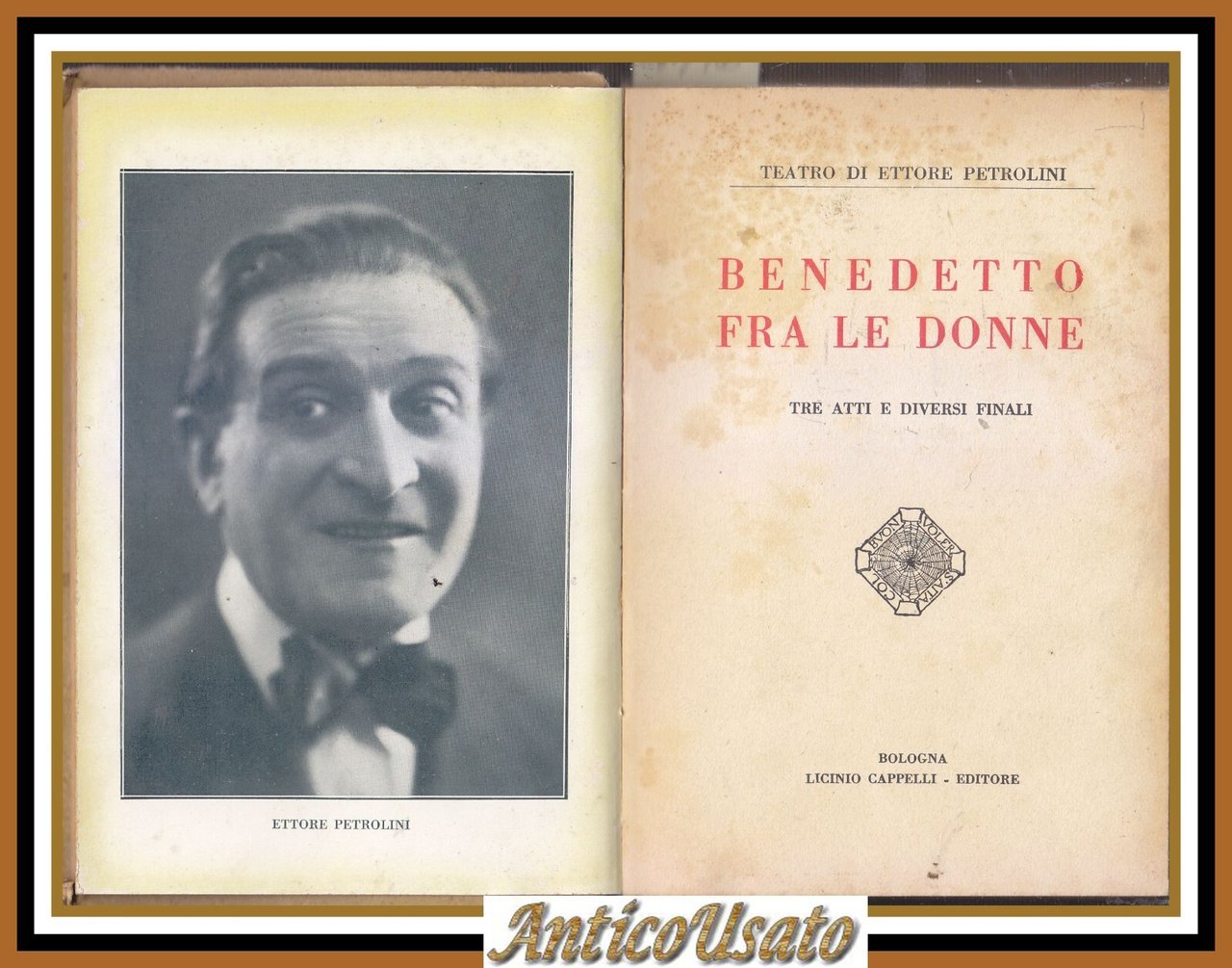 BENEDETTO FRA LE DONNE tre atti e diversi finali di Ettore Petrolini. Licinio Cappelli Editore 1933. 194 Pagine, fotografie in b/n fuori testo e ritratto dell’autore in antiporta. Copertina editoriale in cartone rigido illustrato. Dimensioni: 13 x 18,5 cm. Stato di conservazione: molto buono (piccole mancanze al dorso, pagine ingiallite, firma di appartenenza in antiporta)