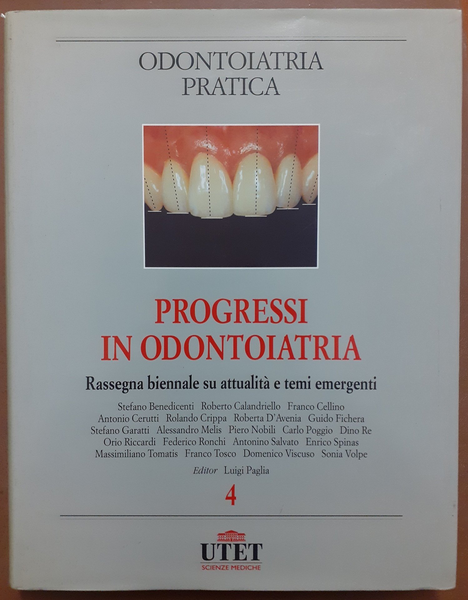 Stefano Benedicenti et al., Progressi in odontoiatria. Rassegna biennale su attualità e temi emergenti. 4, a cura di Luigi Paglia, Utet Scienze Mediche, Torino 2005, pp. XVII, 426, ill. b.n. e col., cm 28, cart. ed. con titoli al dorso, titoli e ill. col. al piatto e sovraccoperta. Collana Odontoiatria pratica. Indice: Sezione I. Clinica (Guido Fichera, Dino Re, Antonio Cerutti, Il restauro estetico-adesivo indiretto nei settori posteriori – Domenico Viscuso, Gnatologia. La patologia disfunzionale dei muscoli masticatori – Antonio Salvato, Carlo Poggio, Ortodonzia. Ortodonzia e impianti: problematiche diagnostiche e operatività clinica – Rolando Crippa, Stefano Benedicenti, Laser. Indicazioni cliniche ai diversi tipi di laser – Orio Riccardi, Protesi. La tecnologia Cad-Cam nella protesi parziale fissa – Roberta D’Avenia, Stefano Garatti, Odontoiatria speciale. Il trattamento del paziente diversamente abile) – Sezione II. Recenti orientamenti (Enrico Spinas, Alessandro Melis, Traumatologia. Approccio conservativo al trattamento delle fratture traumatiche corono-radicolari – Federico Ronchi, Piero Nobili, Odontoiatria biologica. Biocompatibilità dei materiali odontoiatrici – Roberto Calandriello, Massimiliano Tomatis, Implantologia. La funzione immediata nella terapia implantare) – Sezione III. Esercizio professionale (Franco Tosco, Franco Cellino, Sonia Volpe, Gestione. Azienda odontoiatrica e organizzazione: il necessario valore aggiunto) – Indice analitico. Minime tracce d’uso alla sovraccoperta, lievissima ingiallitura della carta, per il resto perfetto.