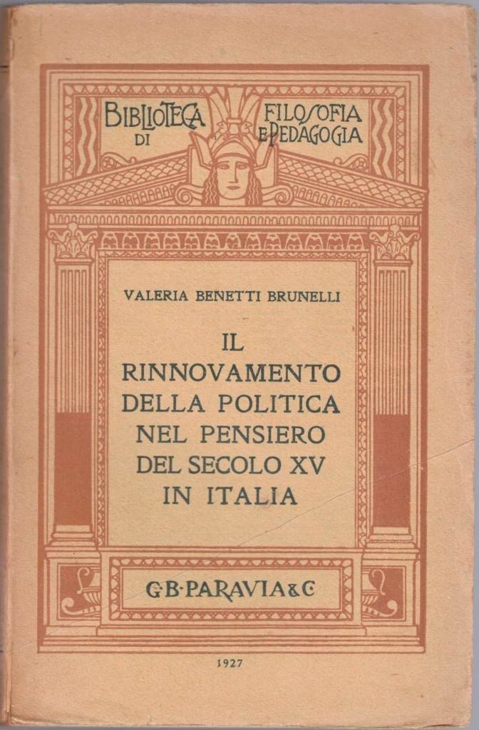 Valeria Benetti Brunelli, Il rinnovamento della politica nel pensiero del secolo XV in Italia, G. B. Paravia e C., Torino 1927, pp. 292, cm 19, br. ed. Collana Biblioteca di filosofia e pedagogia. Alla quarta di copertina, bollo: Aumento sul prezzo di copertina cinque per cento (25 febbraio 1940). Lievi tracce d’uso alla brossura, uno strappetto senza mancanze all’occhiello, leggera brunitura della carta, per il resto ottimo.