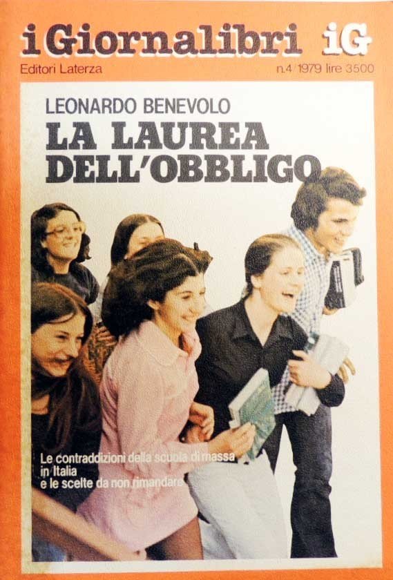 Leonardo Benevolo, La laurea dell’obbligo, Laterza, Roma-Bari 1979, pp. 149, ill. b.n., cm 21, br. ed. Collana I Giornalibri, n. 4/1979. Sulla prima di copertina: Le contraddizioni della scuola di massa in Italia e le scelte da non rimandare. Sommario: Un’indagine dal di dentro – La crisi dell’istruzione di massa – La crisi dell’istruzione pubblica centralizzata – Il ’68: un mito da verificare – Dopo il ’68: la scuola italiana si difende con l’autodistruzione – Documenti. Un’esperienza nella facoltà di architettura di Roma – C’è un futuro per la scuola italiana? – Note. Volume ricco di immagini relative agli anni della contestazione. Lievissimi segni del tempo alla brossura, per il resto perfetto.