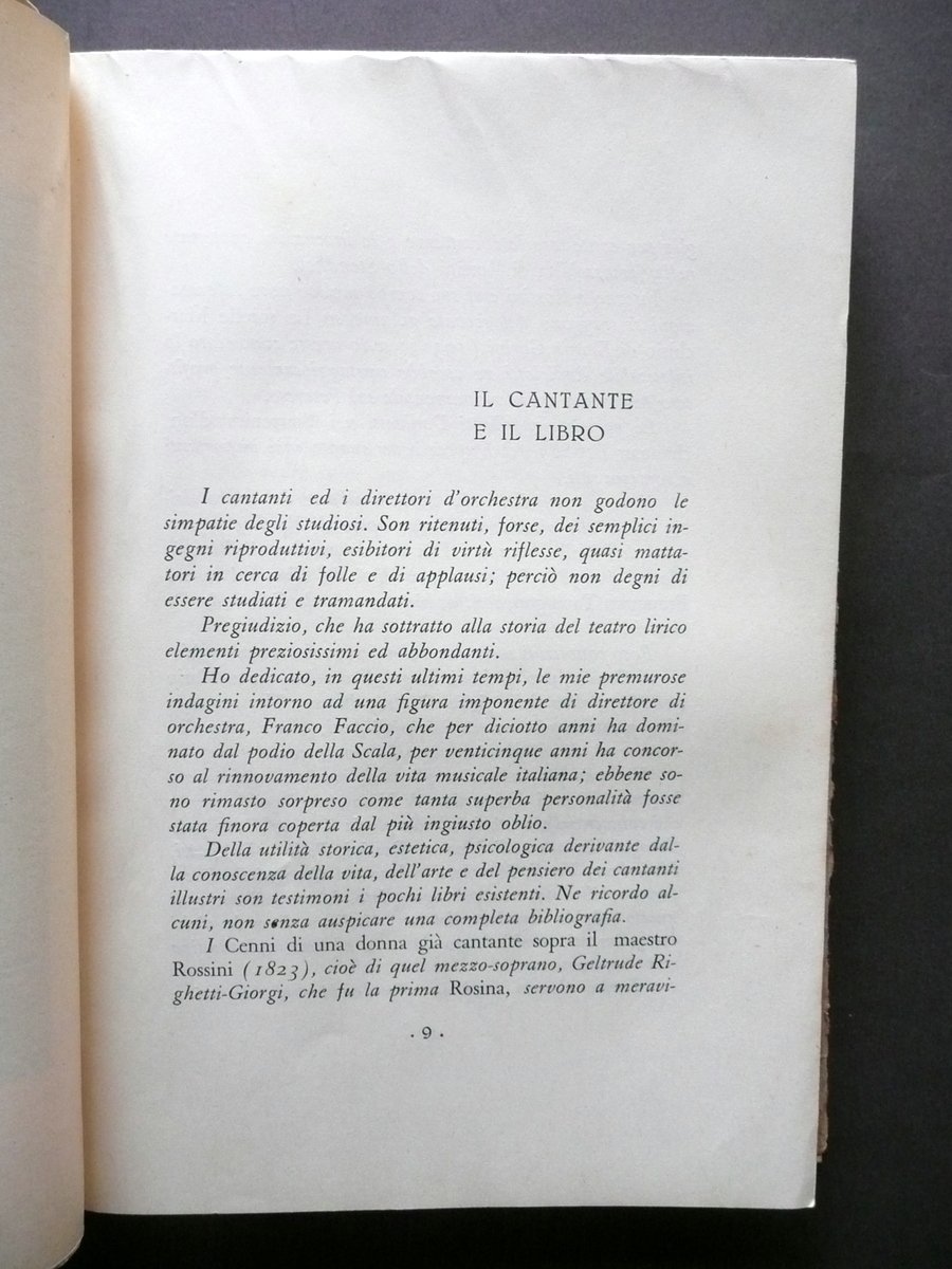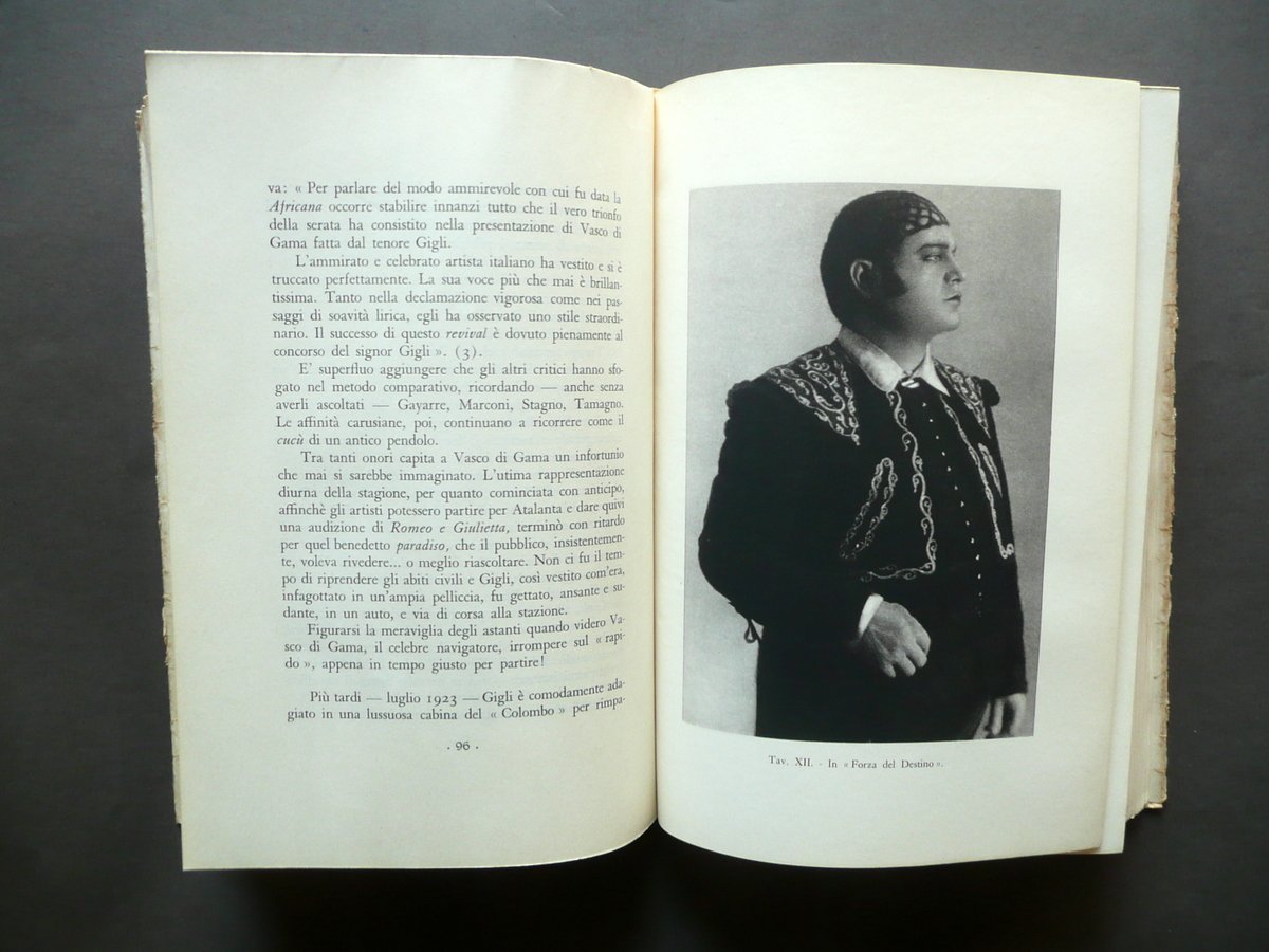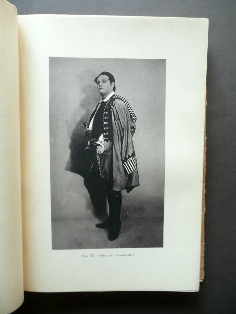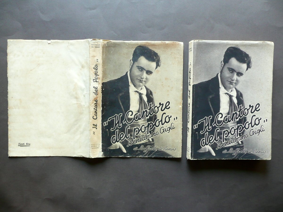 Raffaello de Rensis, Il Cantore del Popolo Beniamino Gigli Società Editrice di Novissima, Roma 1934; cm 25x17,5; pp. 240 con numerose ill. fotogr. in b/n fuori t.; brossura ed. ill. in b/n., con sovraccoperta ed. ill. in b/n. Condizioni di conservazione Volume ben conservato; brossure con alcune minime bruniture e alcuni minuscoli difetti - abrasioni ai margini e agli angoli. Interni buoni, ancora intonsi. Sovraccoperta ed. in condizioni più che discrete con alcune piccole leggere bruniture e qualche ombra di gora di vecchia umidità, una delle quali interessa in misura minima e poco visibile il dorso del volume ma non le pagine; cerniere e margini esterni con strappetti restaurati al retro mediante l'applicazione di strisce di carta; margini con alcuni minimi strappetti, di cui qualcuno restaurato al retro. Esemplare raro. Interni ancora intonsi (esemplare mai sfogliato). SETT139.L13454 N
