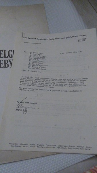 Brossura di grandi dimensioni, raccolta di pubblicità della Benton & Bowles. Si allega lettera fotocopiata contenente una relazione del managing director norvegese Magnus Eide del 1976.