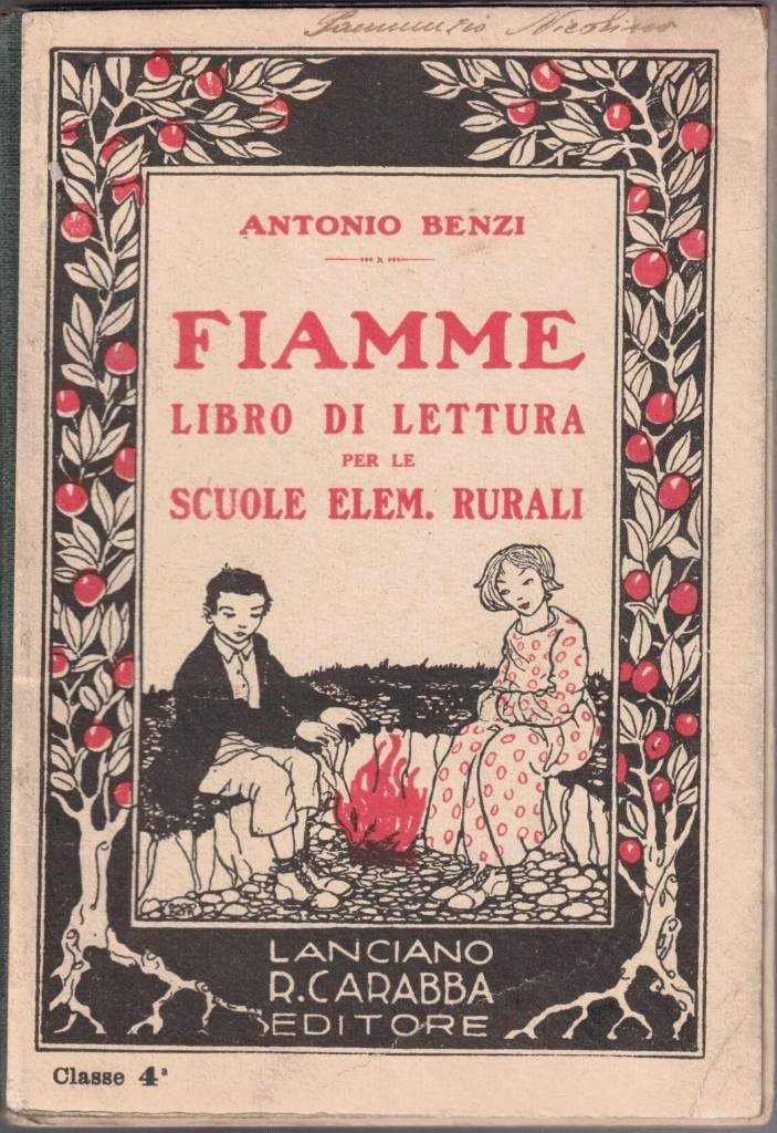 Antonio Benzi, Fiamme. Libro di lettura per la quarta elementare rurale, R. Carabba Editore, Lanciano 1924, pp. 223, ill. b.n., 13 c. di tavv. f.t. ill. b.n., cm 18, legatura ed. in mezza tela con titoli e ill. col. al piatto. In calce al frontespizio: Approvato dalla Commissione Ministeriale per l’esame dei libri di testo. Firma d’appartenenza a margine del piatto anteriore. Leggere tracce d’uso, qualche sporadico segno di lapis, minimi segni del empo, per il resto e nel complesso ben conservato. Raro.