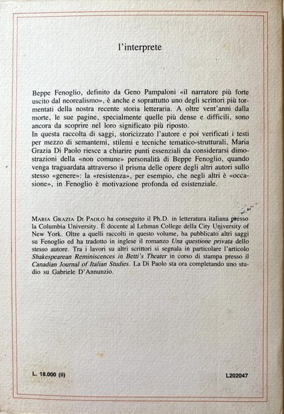 Soggetti: Studi letterari, Storia, Critica letteraria, Letteratura, Novecento, Strutture tematiche, Tecniche letterarie, Analisi, Interpretazione, Romanzi storici, Racconto fenogliani, Eroi, Racconti brevi, Milton, Partigiano Johnny, Guerra, Resistenza, Simbolismo, Fascismo, Dante Isella, Langhe, Novelle, Narrazione breve, Fascisti, Guerra civile, Narrativa, Giudizio, Calvino, Vittorini, Frammenti, Pavese, Primavera di bellezza, Fulvia, Personaggi, Una questione privata, Neorealismo, Semantemi, Stilemi, Linguaggio, Scrittura, Saggi, Citazioni, Opere generali, Bibliografia, Libri Vintage Fuori catalogo, Realismo, Muro, Morte, Sacrificio, Gorgo, Yeats, Raimondi, Merry, I ventitré giorni della città di Alba, Giovanni Federico Biamonti, La malora, Luciana Bombardi, La paga del sabato, Racconti partigiani, Samuel Taylor Coleridge, Studi novecenteschi, Italianistica, Corti, Poe, Literary studies, History, Literary criticism, Literature, Twentieth century, Thematic structures, Literary techniques, Analysis, Interpretation, Historical novels, Heroes, Short stories, Partisan Johnny, War, Resistance, Symbolism, Fascism, Short, Fascists, Civil war, Fiction, Judgment, Fragments, Spring of beauty, Characters, A private matter, Neorealism, Semanthemes, Stylistic elements, Language, Writing, Essays, Quotes, Works, Bibliography, Out of print books, Realism, Wall, Death, Sacrifice, Saturday wages, Partisan tales, Twentieth-century, Italian studies
