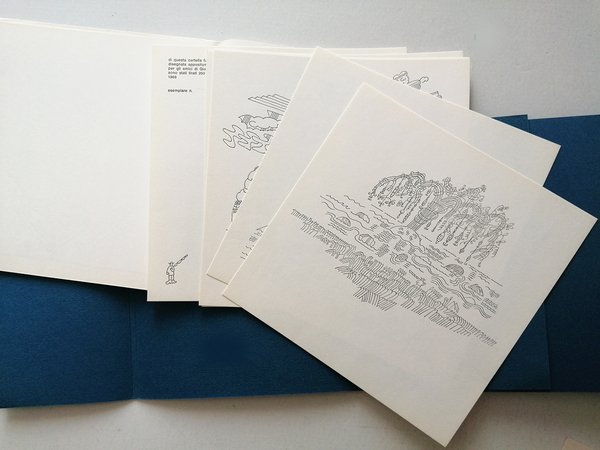 cartellina in cartoncino formato 20X20 contenente una raccolta di 13 tavole sciolte stesso formato con i disegni in B/N di Longoni. Tiratura fuori commercio per gli amici di Giorgio Lucini in 250 esemplari numerati. Bella copia come nuova