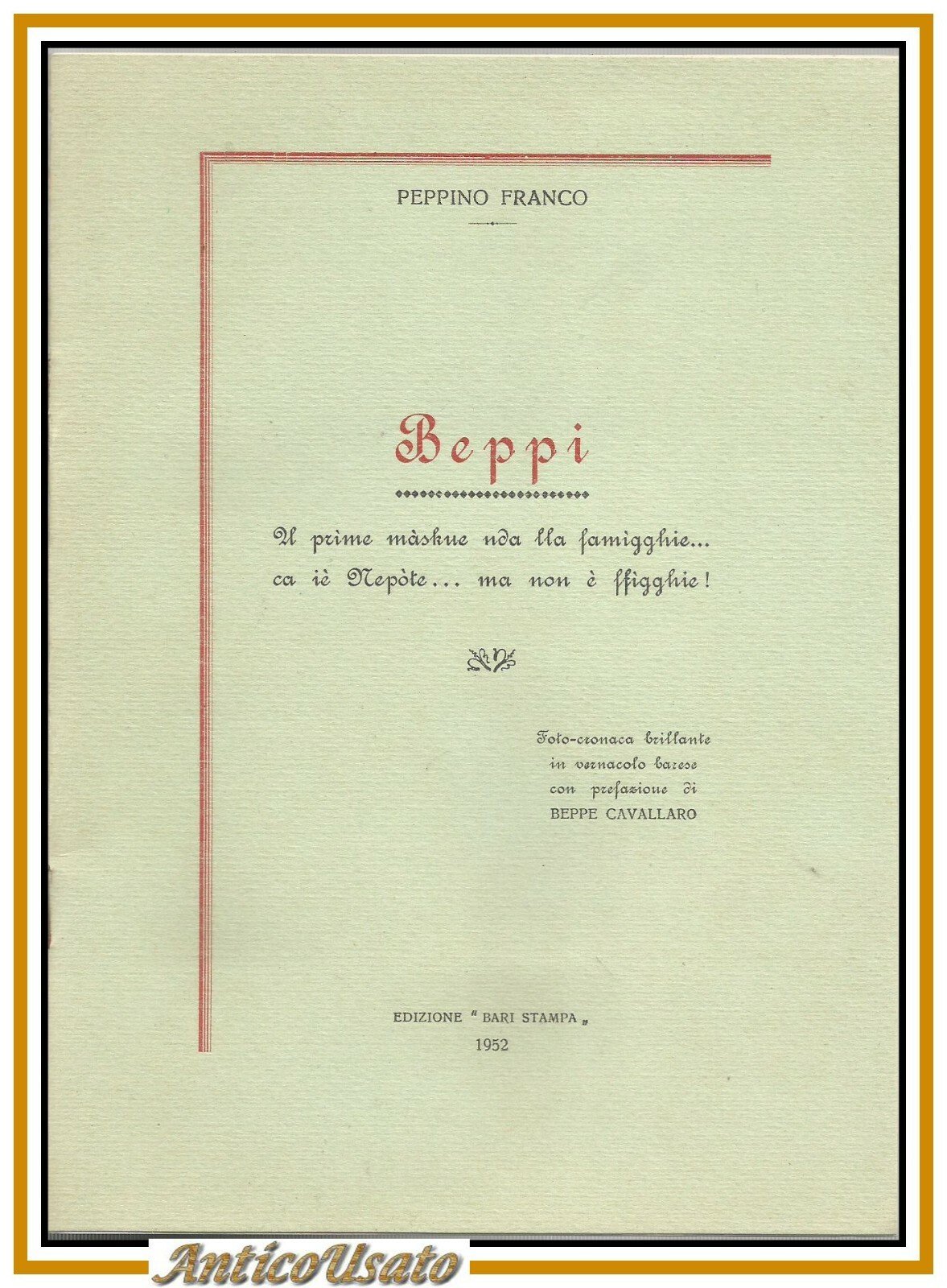 Beppi u prime maskue nda lla famigghie ca ié Nepote ma non é ffigghie di Peppino Franco. Poemetto in vernacolo. Edizione Bari Stampa 1952. 16 pagine, Dedica autografa dell'autore in antiporta. Copertina editoriale in brossura. Stato di conservazione: molto buono (pagine appena ingiallite)