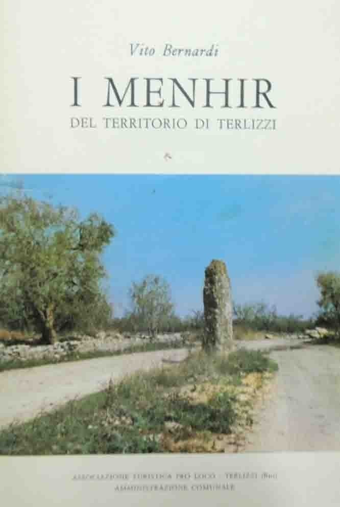 Vito Berardi, I menhir del territorio di Terlizzi, Mezzina, Molfetta 1981, pp. 29, ill. b.n., cm 17, pubblicazione spillata. In calce alla prima di copertina: Associazione Turistica Pro Loco – Terlizzi (Bari) – Amministrazione Comunale. Al frontespizio, dedica manoscritta dell’autore. Leggere tracce d’uso, per il resto buona copia.