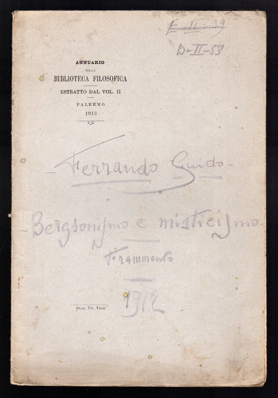Opuscolo vintage. Estratto dall'Annuario della Biblioteca Filosofica vol. 2. Segni a matita in copertina, in prima pagina e sottolineature all'interno, usura da scaffale. Ordinario segno del tempo.
