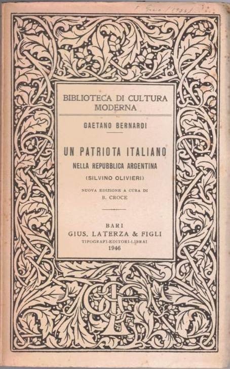 Gaetano Bernardi, Un patriota italiano nella Repubblica Argentina. Silvino Oliveri, nuova edizione a cura di B. Croce, Gius. Laterza e Figli Tipografi-editori-librai, Bari 1946, pp. 106, al contro frontespizio 1 c. di tav. f.t. con ritratto fotografico dell’Olivieri, cm 20, br. ed. Collana Biblioteca di cultura moderna, vol. 409. Firma d’appartenenza e data a margine di prima di copertina e occhiello. Minime tracce d’uso, lievi fioriture, carta leggermente brunita, per il resto ben conservato.