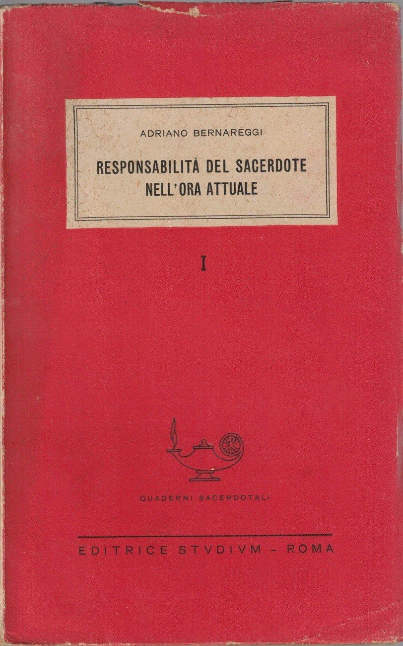 Adriano Bernareggi, Responsabilità del sacerdote nell’ora attuale, Editrice Studium, Roma 1945, pp. 67, cm 19, br. ed. Collana Quaderni sacerdotali, vol. 1. Leggere tracce d’uso, uniforme brunitura della carta, per il resto ben conservato. In parte intonso.