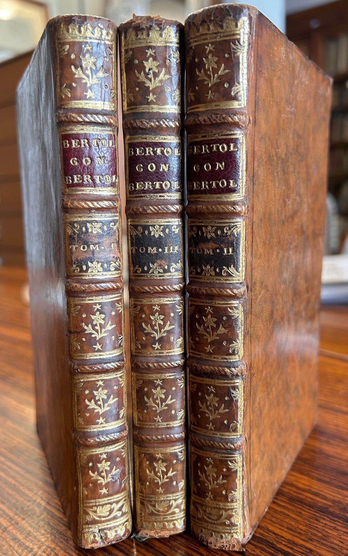 >3 vol. in-8 (174x110 mm), pp.(24), 725 (numerazione continua), bella legatura coeva piena pelle, dorsi a nervi con ricchi fregi e titolo in oro, tagli rossi. Testo italiano in carattere corsivo, a fronte la traduzione in lingua veneziana in carattere tondo. Rara edizione, illustrata da 6 incisioni a piena pagina e tre vignette sui titoli di tipica arte veneta, non firmate, assai divertenti. Le ultima 40 pp. contengono la "spiegazion de certe parole veneziane, che no fusse capie in ogni logo". Romanzo burlesco popolare cinquecentesco del Croce (1550-1609), basato su di una nota leggenda (Disputa di Salomone con Marcolfo) posto in versi in 20 canti da illustri letterati quali, Baruffaldi, Zanotti, Lapi, Zampieri ed altri. Esemplare ben condervatoin elegante legatura del tempo (difetti alle cuffie). Cat, Lapiccirrella, Vewneziani, n.157. Manca al Morazzoni e a varie bibliografie.