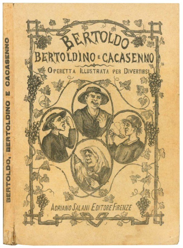 Bertoldo, Bertoldino e Cacasenno, operetta illustrata per divertirsi. Astuzie sottilissime di Bertoldo dove si sente di un villano accorto e sagace che dopo varj e strani accidenti, alla fine, pel suo raro ed acuto ingegno, vien fatto uomo di Corte e Regio Consigliere. Con l'aggiunta del suo testamento e altri detti sentenziosi. Operetta piena di moralità e di spasso.