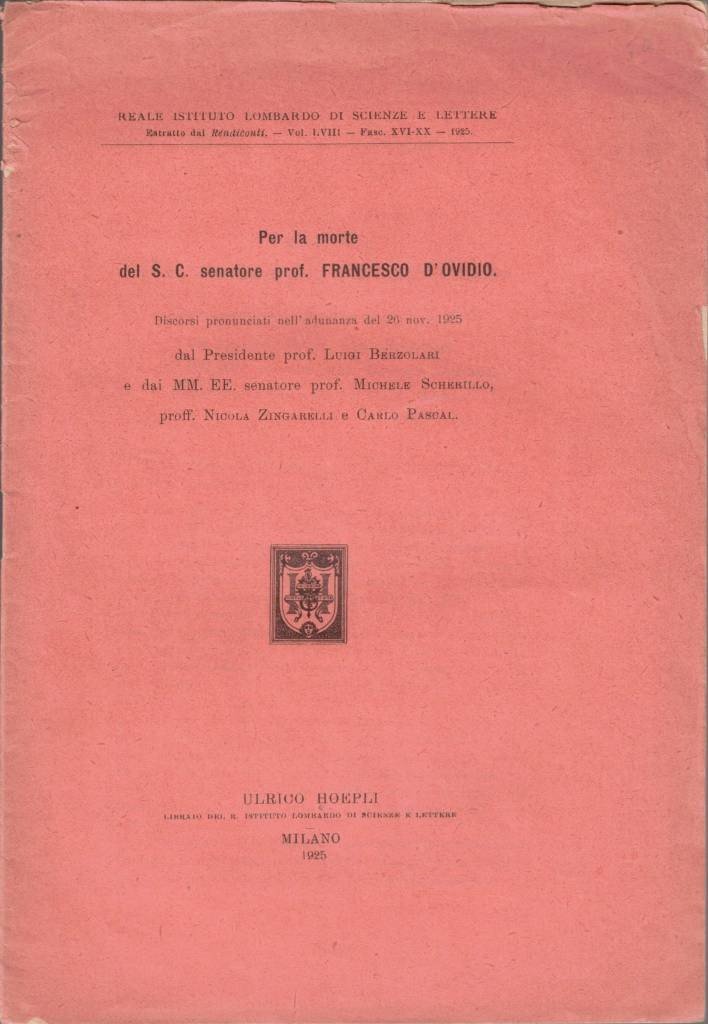 Per la morte del S. C. senatore prof. Francesco D’Ovidio. Discorsi pronunciati nell’adunanza del 29 nov. 1925 dal Presidente prof. Luigi Berzolari e dai MM. EE. senatore prof. Michele Scherillo, proff. Nicola Zingarelli e Carlo Pascal, Ulrico Hoepli Libraio del R. Istituto Lombardo di Scienze e Lettere, Milano 1925, pp. 778-792, cm 24, br. ed. Descrizione effettuata sulla base della prima di copertina. In testa alla prima di copertina: Reale Istituto Lombardo di Scienze e Lettere. Estratto dai Rendiconti, vol. LVIII, fasc. XVI-XX, 1925. Leggere tracce d’uso alla copertina, minima brunitura della carta, per il resto ben conservato. Intonso.