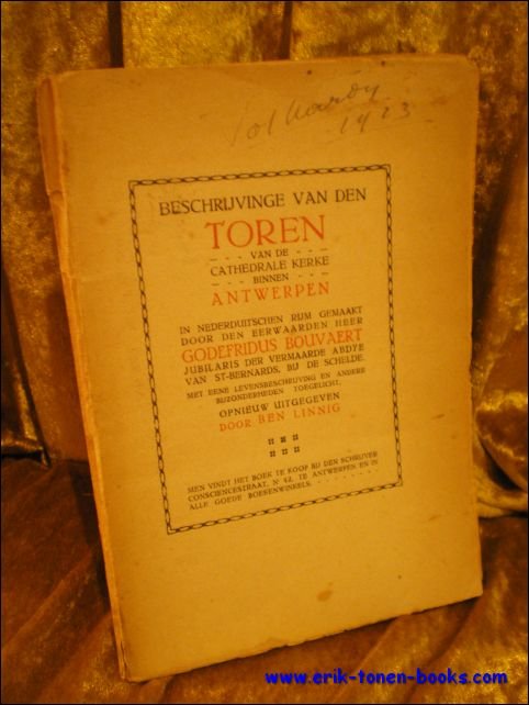 oorspronkelijk papieromslag met tekstopdruk in zwart en rood, frontispice, 140 x 200mm., 73pp., fleurons. *** Rug is volledig beschadigd. Genummerd exemplaar binnen een oplage van 500. Opnieuw uitgegeven door Ben Linnig die het ook korttekende.