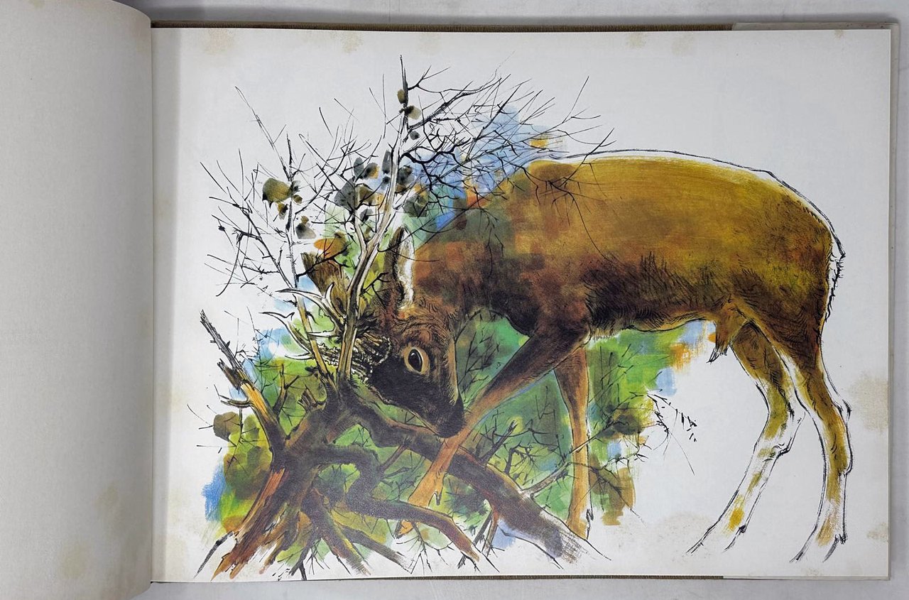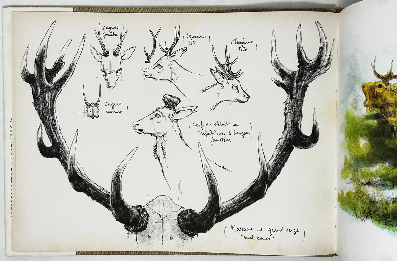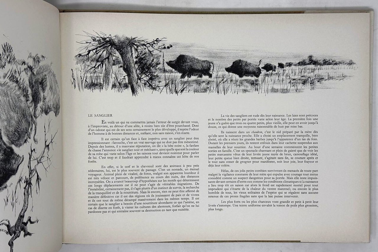 autore: Maurice Parent. Presenté par M. Maurice Genevoix de l'Academie Francaise. éditions Daniel Cavayé, Paris. Anno: 1974. Prima edizione. Tiratura limitata a 3.000 esemplari numerati (esemplare n° 1937). Lingua del testo: francese. Formato: 39 X 29 cm circa. Pagine non numerate: in totale 120 pagine + 14 tavole a piena pagina (con retro bianco) illustrate a colori e su foglio di carta in finitura lucida (a differenza delle altre pagine). 112 illustrazioni (gravures) totali (tra quelle in nero nel testo e le 14 tavole a colori). Stupendo libro illustrato dedicato agli animali selvatici che è possibile incontrare nei boschi della Valle della Loira e che hanno sempre affascinato e incantato l'autore. Stato di conservazione: si segnalano alcuni lievi ingiallimenti (sia sulla sovraccoperta che su alcune pagine interne - in particolare sui margini di qualche tavola e sui margini di qualche pagina frontale alle tavole ma sono, comunque, leggeri e non deturpanti e presenti solo su qualche pagina), un piccolo strappetto (senza mancanza) sul margine inferiore della sovraccoperta posteriore e un minuscolo taglietto (senza mancanza) sul margine verticale destro sempre della sovraccoperta posteriore (in prossimità del dorso) ma nel complesso un buon esemplare. Copertina in tutta tela grigia con titolo in oro sul piatto anteriore e sul dorso e sovraccoperta illustrata a colori.