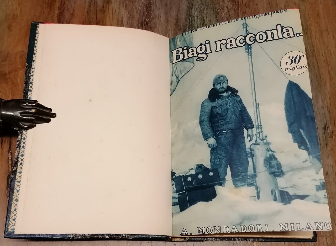 (Spedizione Nobile - Dirigibile Italia - Artico - Polo Nord - Tenda rossa - Medicinesi illustri) In 8°, legatura coeva in mezza pelle con angoli, dorso a 4 nervi con titolo e filetti dorati e ricche impressioni a secco, carta marmorizzata ai piatti, guardie in carta Varese, taglio di testa in colore rosso, conservato il piatto anteriore illustrato della brossura editoriale, pp. 153,(4), con 22 illustrazioni fuori testo ed un grafico. Seconda edizione. Le memorie dell'ufficiale di marina marconista Giuseppe Biagi che con il trasmettitore "Ondina" salvò i superstiti della spedizione Nobile precipitati con l'aeronave 'Italia' sui banchi di ghiaccio vicino all'isola Foyn a Nord Est delle Spitzbergen. Volume ben conservato.