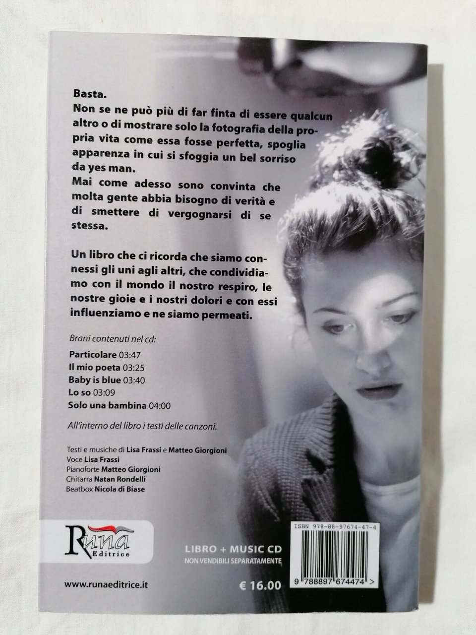 Autore: Lisa Frassi Formato: Copertina flessibile Pagine: 274 Collana: Introspezioni Data Pubblicazione: 31 marzo 2015 Edizione: 1 edizione Condizioni: perfette (eccetto la mancanza del CD audio) 2G-9-12Descrizione: Lisa Frassi, con i suoi racconti e le sue canzoni, ci accompagna in un viaggio attraverso la Leggerezza dell'Essere, dove forse troveremo qualcosa che ci rappresenta, un pezzo di noi stessi, un ricordo lontano, un desiderio inconfessabile, un sogno confuso e in qualche momento ne rimarremo sorpresi, divertiti, scandalizzati. Non è più il reality a emozionare, bensì la realtà, l'unica speranza che ancora abbiamo per sfuggire a un'esistenza grigia, mediocre, finta e claustrofobica. Ora è il momento di ribellarsi all'apparenza per tornare a essere. Ora è il momento di evolvere, questa vita se lo aspetta da noi! Autenticità è ciò di cui abbiamo bisogno, ora! La meravigliosa sensazione di libertà e l'idea di poter realizzare qualsiasi cosa. Essere se stessi esprime una libertà, a volte mal contenuta, un quadro che cerca disperatamente i pennelli e i colori con i quali essere dipinto. Essere se stessi ci spaventa, perché abbiamo paura di non essere accettati. Essere se stessi in un mondo fatto di apparenze e di audience sembra una contraddizione. Essere se stessi è toglierci la maschera e mostrarci come siamo: è la nostra più grande paura, ma anche la miglior soluzione per noi.
