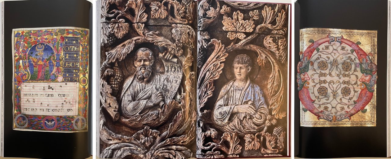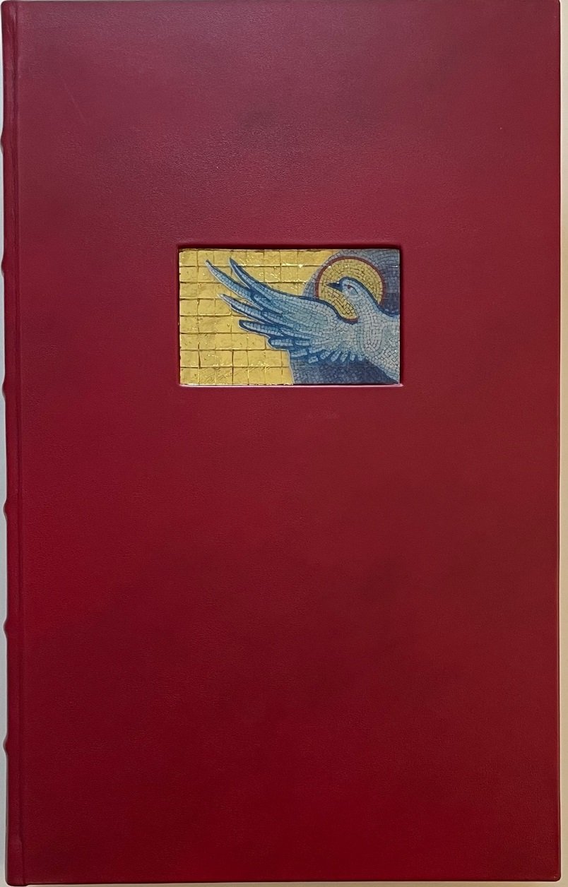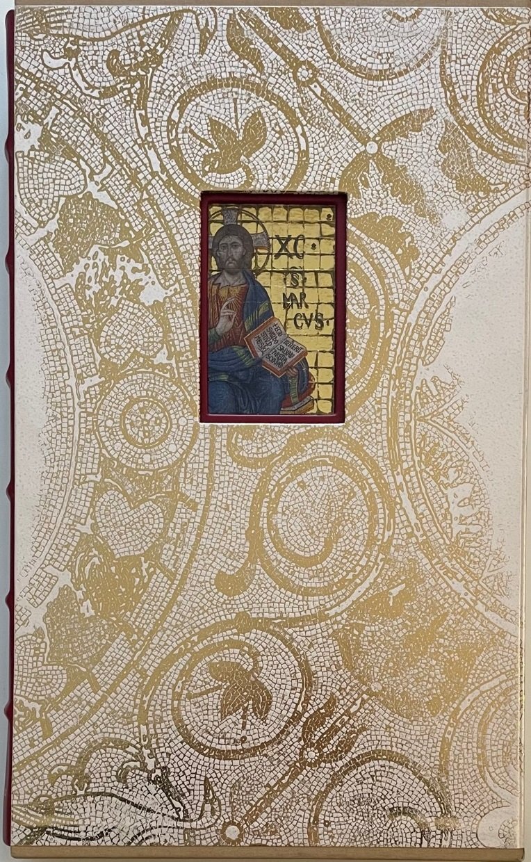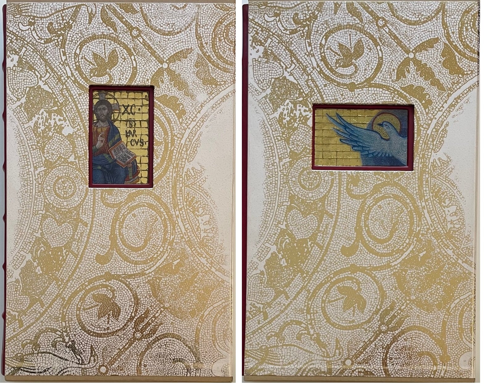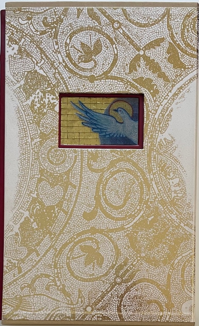 - Piena pelle di vitello concia naturale, dorsi con sei nervi e titoli stampati in oro, piatti con al centro, incassato, mosaico in vertoceramica e oro.
