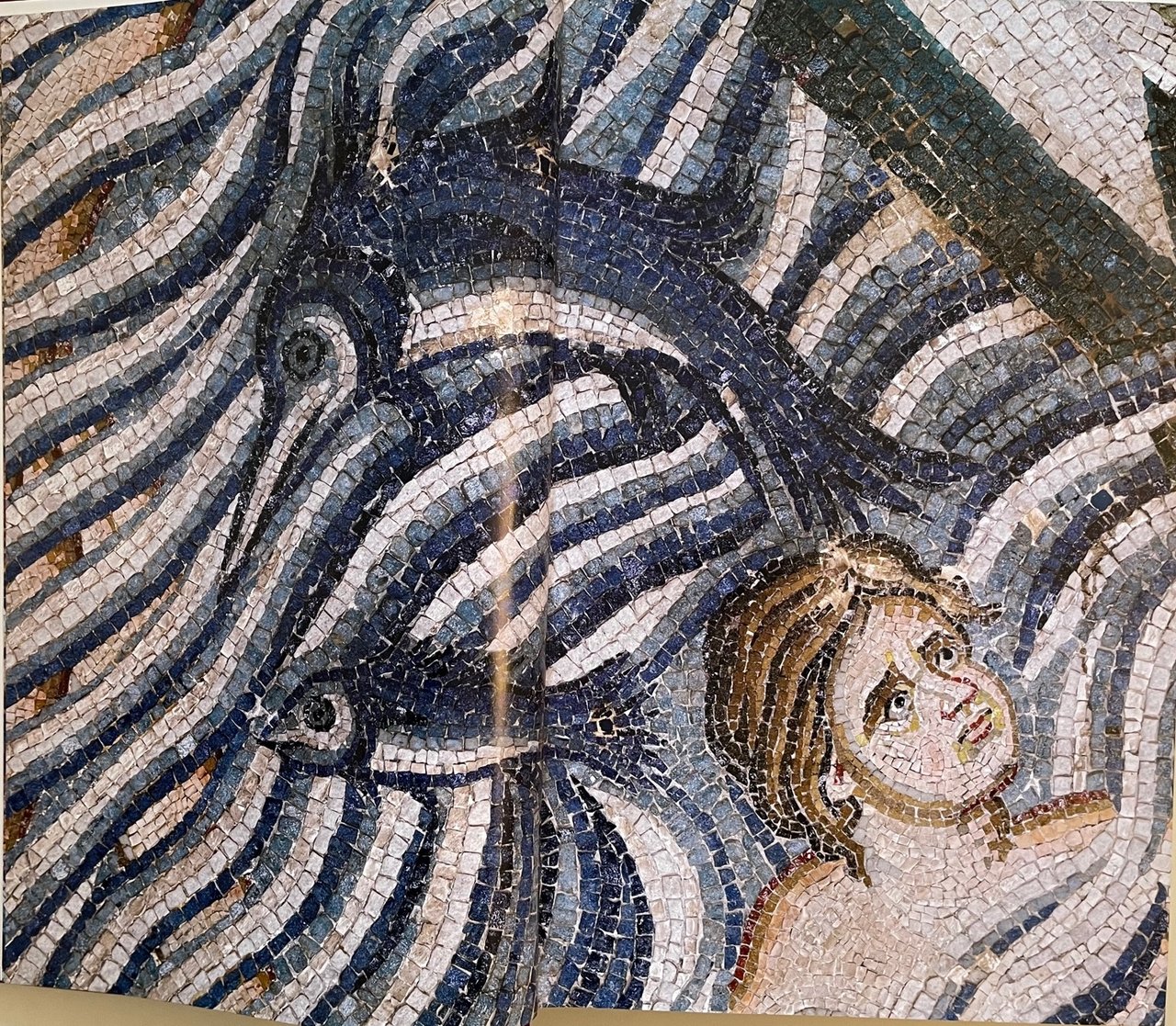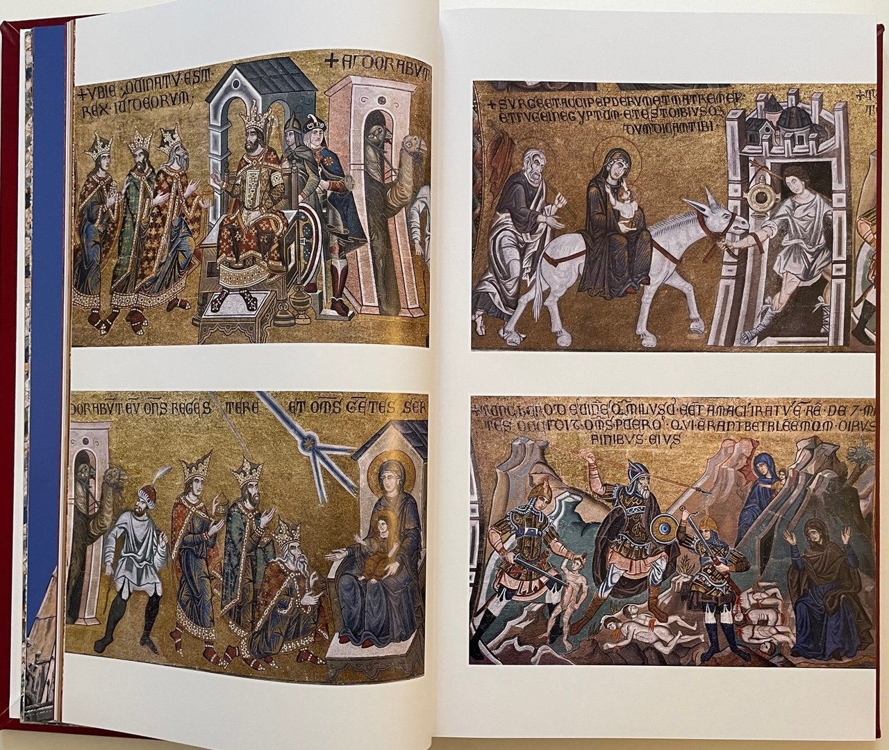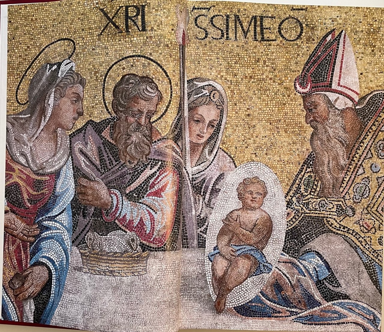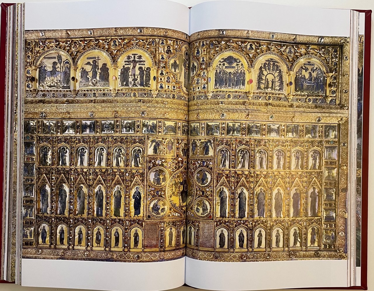 - Piena pelle di vitello concia naturale, dorsi con sei nervi e titoli stampati in oro, piatti con al centro, incassato, mosaico in vertoceramica e oro.