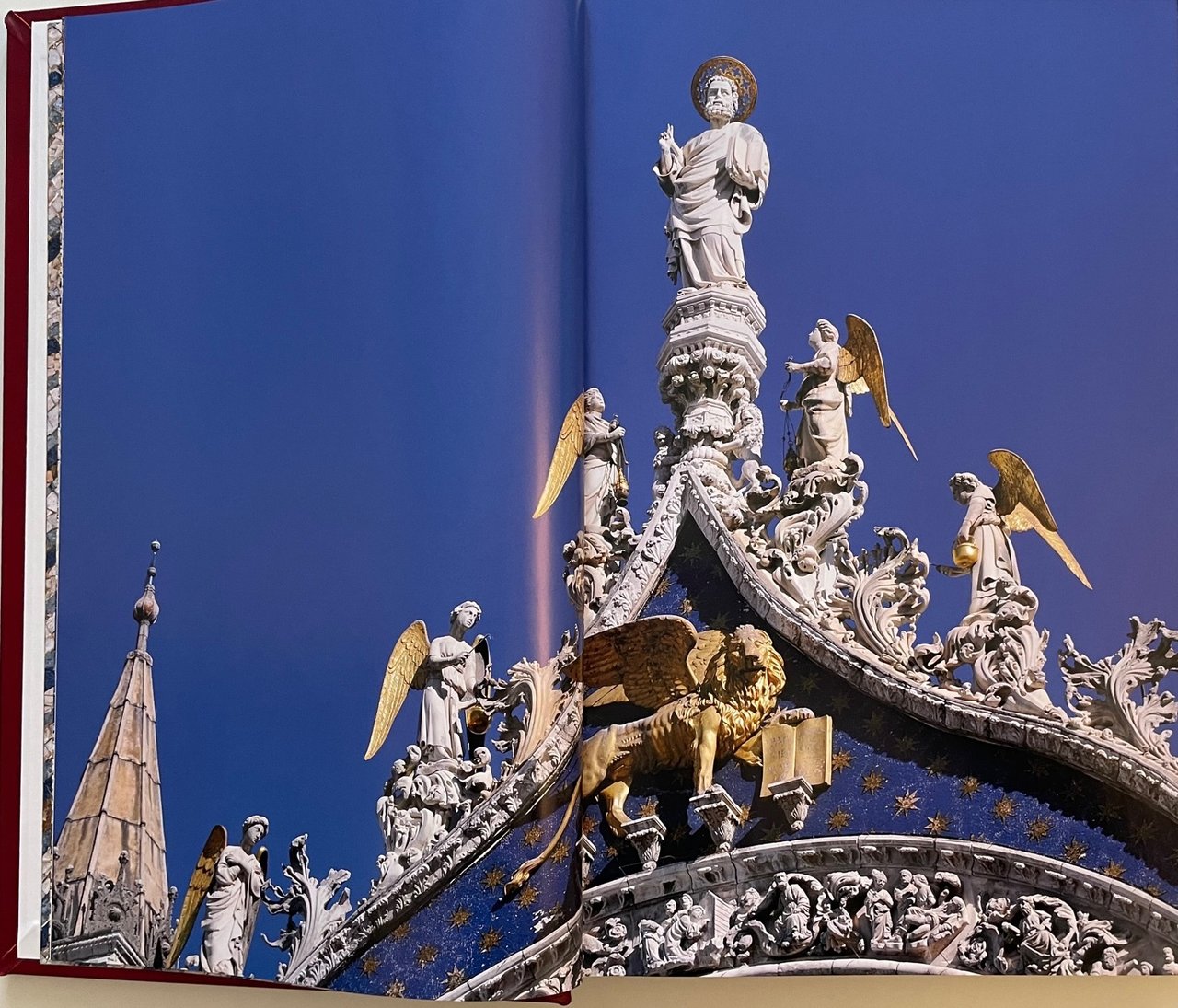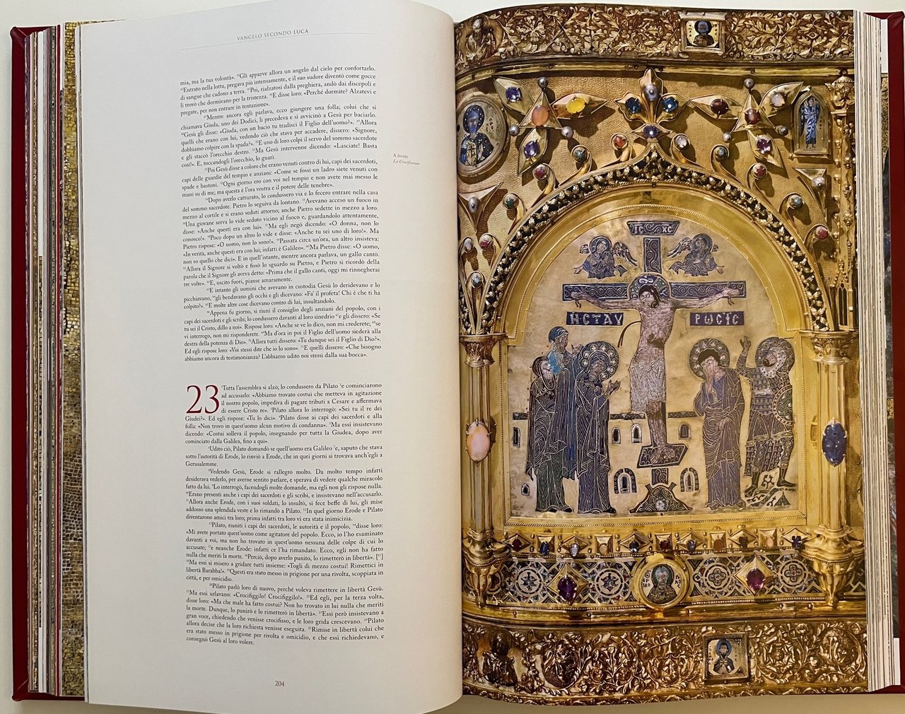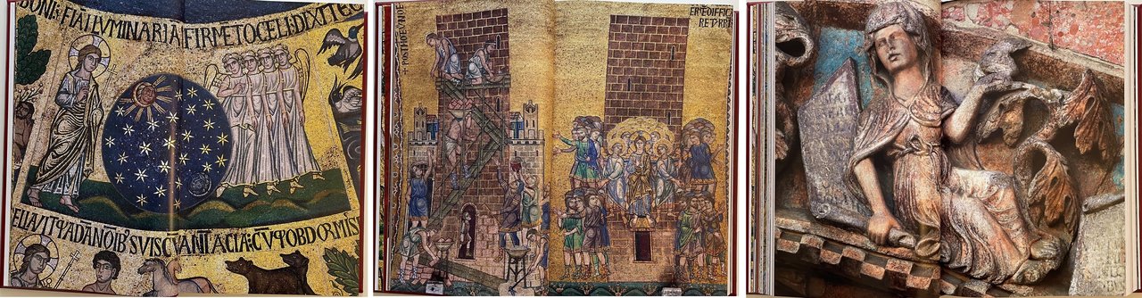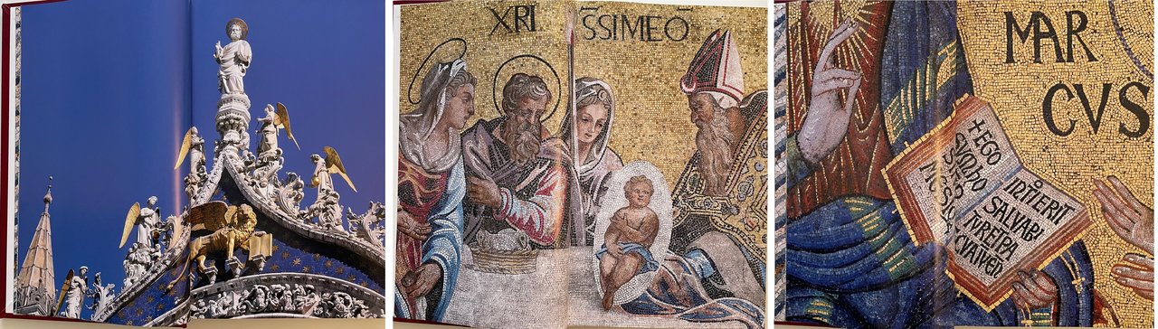 Bibbia di Venezia. Vecchio e Nuovo Testamento (Venice bible). Scripta Maneant, 2013. Ultima traduzione completa della Sacra Bibbia a cura della CEI, con coordinamento di Mons. Giuseppe Betori. Fotografo Sandro Vannini. Opera in due volumi (ormato 29x47 cm.) : Antico Testamento (pagine 600), Nuovo Testamento (pagine 416). All’interno il testo si alterna ai capolavori dei mosaici policromi della straordinaria Basilica veneziana. Legatura in piena pelle di vitello conciata al naturale, dorsi con sei nervi e titoli stampati in oro, piatti con al centro, incassato, mosaico in vertoceramica e oro. I volumi sono custoditi in appositi cofanetti. Tiratura di 1999 esemplari. Condizione ottima.