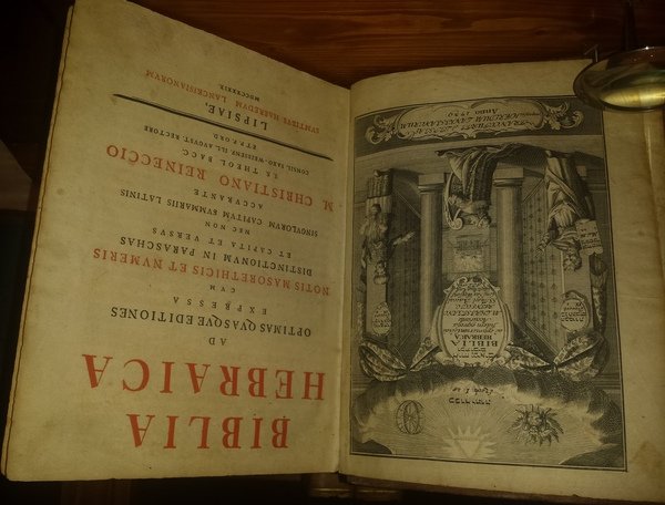In-4 (23,5 cm) (1) c. (antiporta) (8) 654 (2) 466 (2). Frontespizio stampato in rosso e nero, testatine, capolettera e finalini. Bell'antiporta inciso rappresentante vignetta allegorica con titolo differente: "Biblia Hebraica ad optimorum Codicii fidem expressa accurante M. Christiano Reineccio. S. S. Theol. Baccal. Cons. Sax-Weissens illust Aug. Rect. et P.P. ord.". Piena pelle, tassello in pelle rossa con caratteri e fregi dorati al dorso. Dedica al benevolo lettore in latino. Il resto del testo in ebraico. This edition distinguishes itself from the former, through the order of pages, which do not run from the right to the left but vice versa. The order of books is given in accordance with the German Bibles." (Pick B. History of the Printed Editions of the Old Testament, together with a Description of the Rabbinic and Polyglot Bibles. Hebraica, 1892). Cerniere logore, per altro ottimo esemplare.