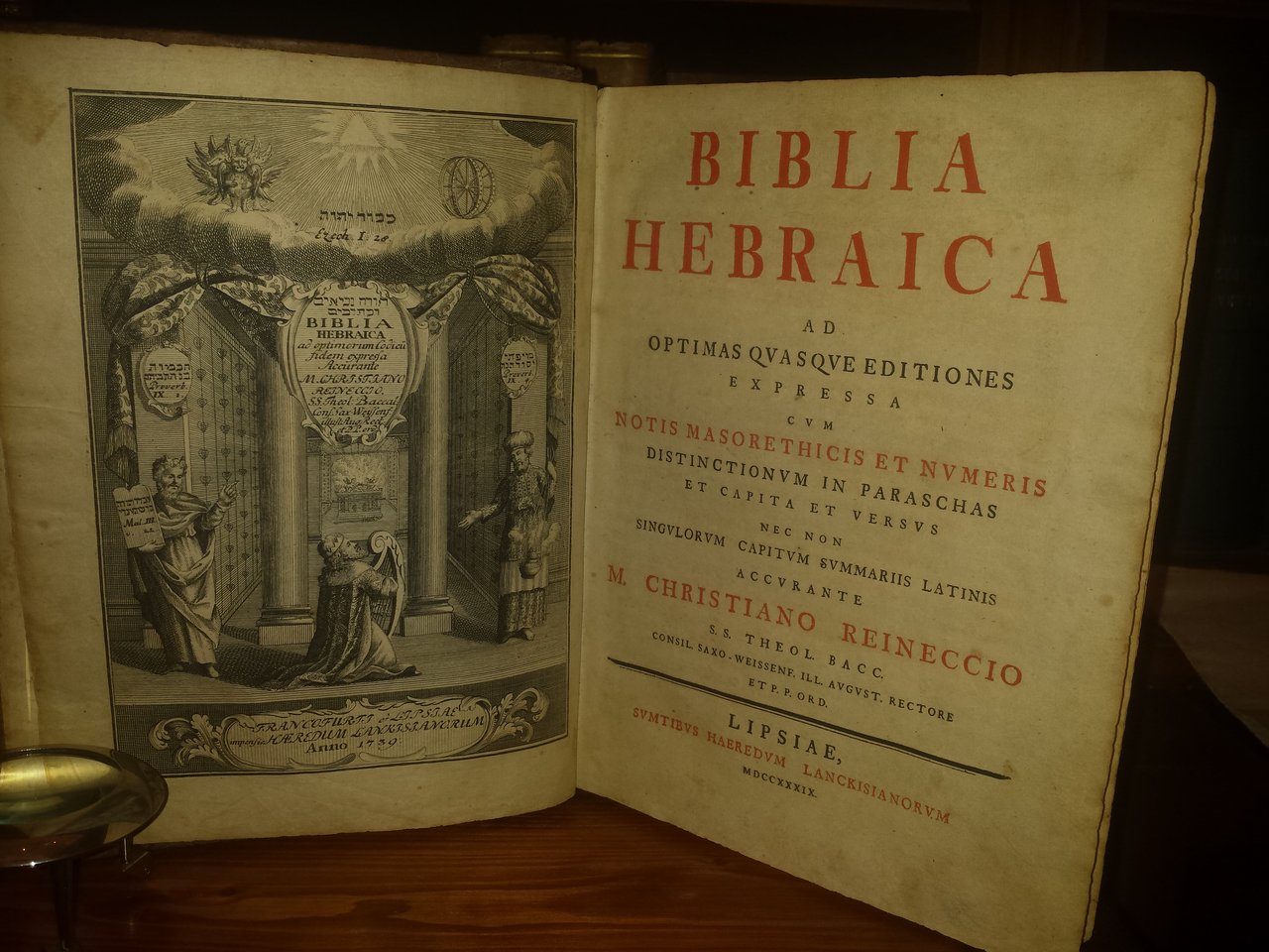 Biblia hebraica ad optimas quasque editiones expressa cum notis Masorethicis et numeris distinctionum in paraschas et capita et versus nec non singulorum capitum summariis latinis accurante M. Christiano Reineccio S. S. Theol. Bacc- consil. Saxo-Weissenf. ill. August. Rectore et P. P. Ord.
