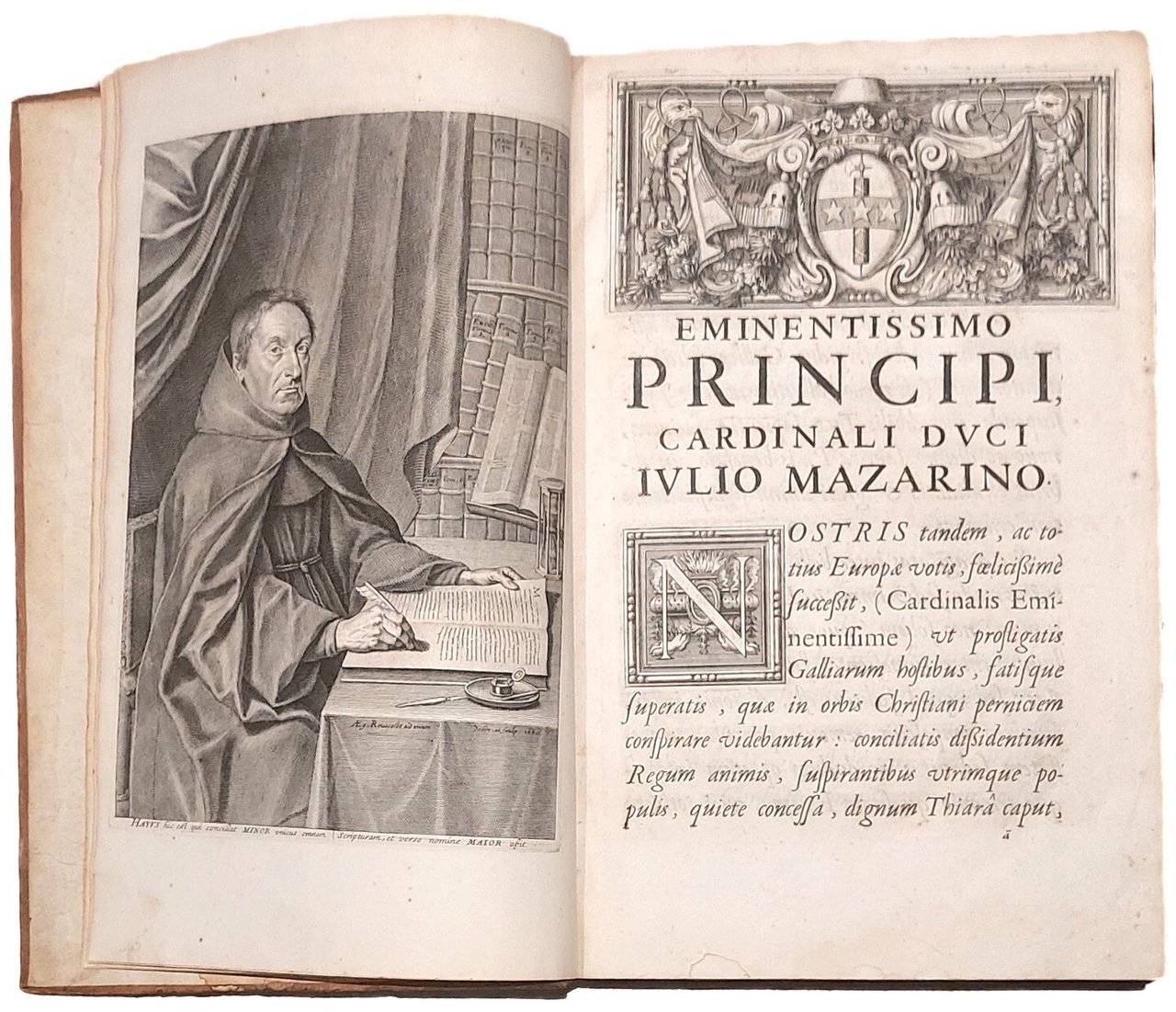 Impresa tipografica ai titoli, impressi in rosso e nero. Il primo volume reca un antiporta con ritratto di Jean de La Haye inciso da Gilles Rousselet e una carta della Terra Santa incisa da due lastre, in questo caso unite a formare una tavola ripiegata, grande testata con lo stemma di Mazzarino entro panoplia. Impresa di Jean Hénault alla fine del volume II. Il primo libro di ogni volume, ad eccezione dei due finali di Indici, ha una testata, per un totale di 17 scene bibliche. In alcuni esemplari del volume XVII sono aggiunti 6 fogli che ripetono la dedicatoria a Mazzarino.