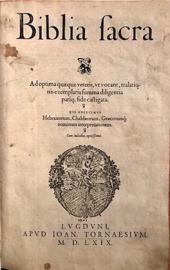 Biblia sacra ad optima quaeque veteris, ut vocant, tralationis exemplaria summa diligentia pariq; fide castigata. His adiecimus Hebraicorum, Chaldaeorum, Graecorumq; nominum intepretationem. Cum Indicibus copiosissimis