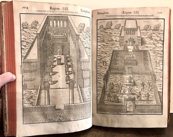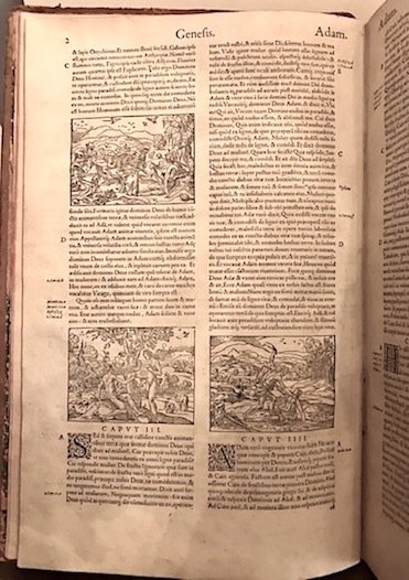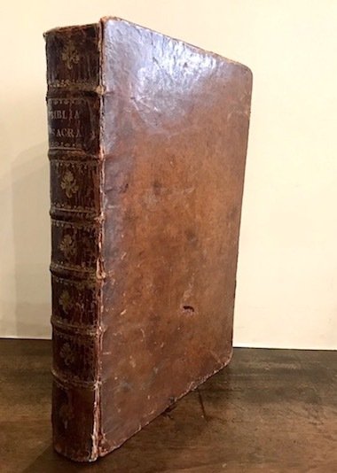 Folio (cm. 36), 6 cc.nn., 660 pp., 54 cc.nn. Con 190 illustrazioni xilografiche n.t. (di cui una a doppia pagina) di Bernard Salomon. Marca tipografica al frontespizio. Iniziali e fregi n.t. Testo su due colonne. Legatura ‘700 in piena pelle con nervi, ricchi fregi e titolo oro su tassello al ds. (cerniere deboli, alcune abrasioni e tracce d’usura soprattutto al dorso). Tagli rossi. Ex libris di collezione privata al contropiatto anteriore. Lievi aloni e qualche brunitura, peraltro interni in ottimo stato di conservazione. Seconda rara edizione in folio della Bibbia dell’editore lionese Jean de Tournes (la prima è del 1556). Br. Libr., p. 55; Graesse I, p. 394. Non in Adams