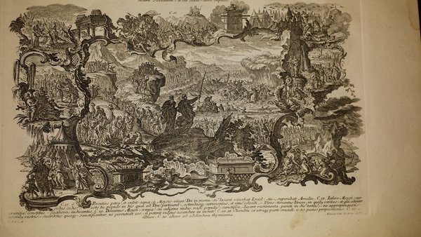In-folio oblungo (25 x 40 cm) (1) c. (di tav.) 100 c. (di tav.). Mezza pelle. Legatura con lievi segni di usura. Bella carta vergata forte. Bell'album di 100 acqueforti incise a bulino (nel 1748, per la prima edizione), dai fratelli Klauber, di cui settantacinque tratte dai disegni di Johann Adam Stockmann. Tutte le stampe presentano cornici con profilo mistilineo di gusto rococò e raffiguranti scene bibliche a partire dalla genesi del Vecchio Testamento all'apocalisse, nel nuovo.