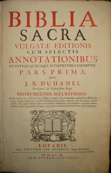 Biblia sacra vulgatae editionis cum selectis annotationibus ex optimis quibusque interpretibus excerptis. Pars prima (. Pars altera). Autore J.B. Duhamel. Editio secunda accuratissima.