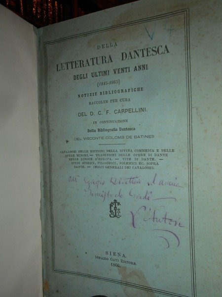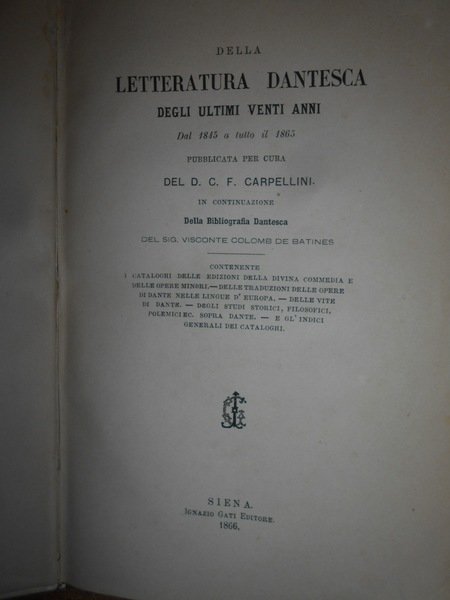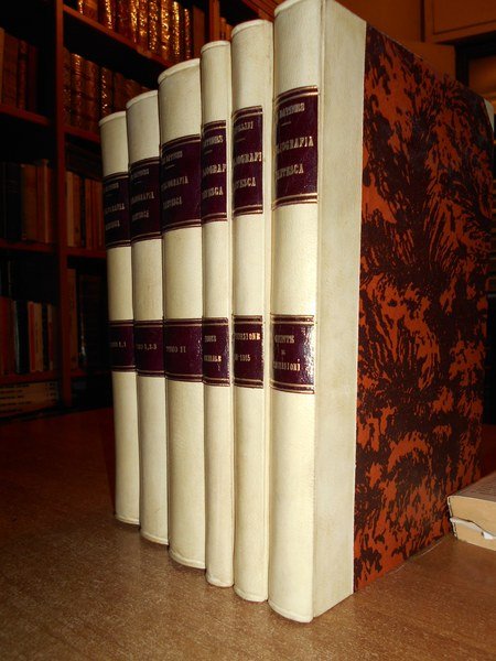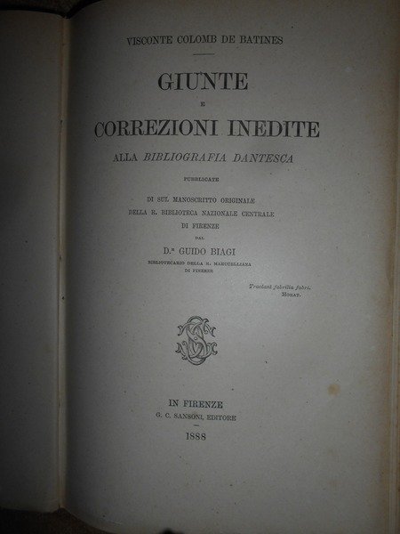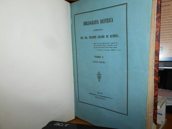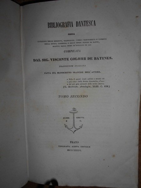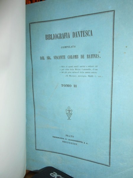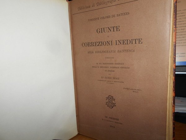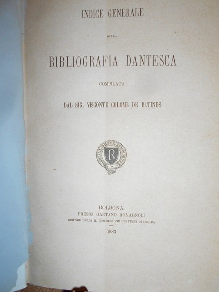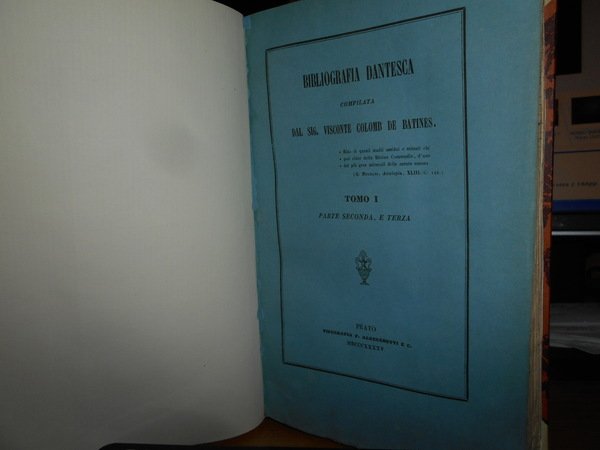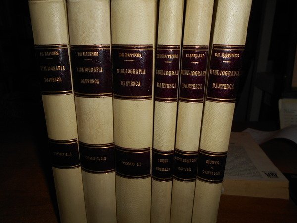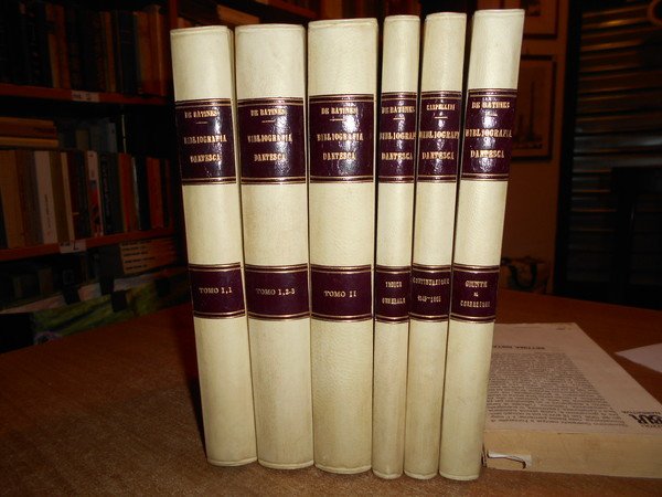 Visconte Colomb De Batines. C.F. Carpellini. Prato, Tipografia Aldina Editrice, 1845. Siena, Ignazio Gatti Editore,1866. Bologna, Presso Gaetano Romagnoli Editore, 1883. Bibliografia Dantesca ossia catalogo delle edizioni, traduzioni, codici manoscritti e commenti della Divina Commedia e delle Opere minori di Dante, seguito dalla serie de' Biografi di Lui compilata. 6 volumi in-8°, m. pergamena con angoli, titoli in oroentro tasselli ai dorsi, copertine originali conservate. Tomo I. parte prima: viii, 351, (1 p. bianca); Tomo I. parte seconda e terza: (ii), 356-769, (1) pp.; Tomo II. ix, 387, (1) pp. (intonso); In continuazione della Bibliografia Dantesca 1845/1865. xcvi, 116,(2) pp. con dedica dell' Autore non firmata in copertina; Indice generale della Bibliografia Danteca. (iv), 174, (2) pp. Giunte e correzioni inedite alla Bibliografia Dantesca pubblicate di sul manoscritto originale della R. Biblioteca Nazionale Centrale di Firenze dal Dr. Guido Biagi. x, 262, (6) pp. Esemplare molto bello in prima edizione con le copertine originali conservate in barbe. Uff. E - II - 3 - 2