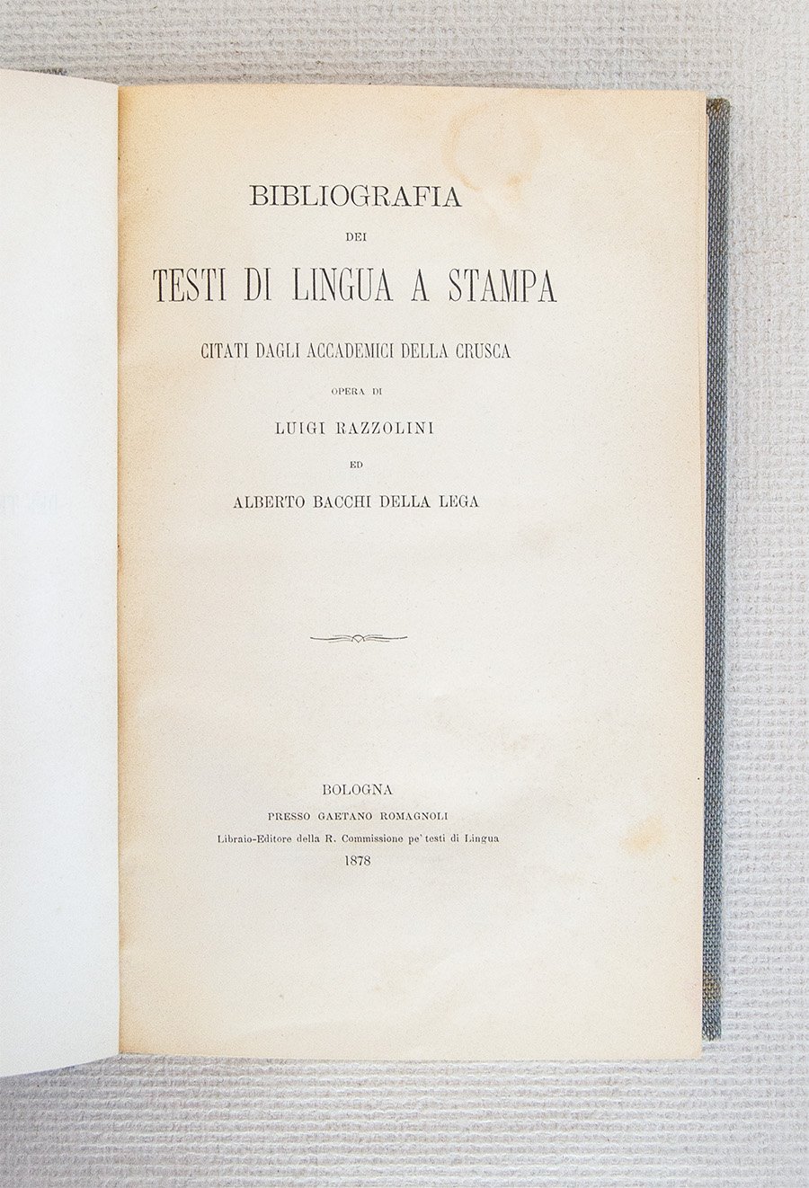 PRIMA EDIZIONE. X, 462 pp. + errata. Rara edizione di questa fondamentale bibliografia della celebre Accademia della Crusca.