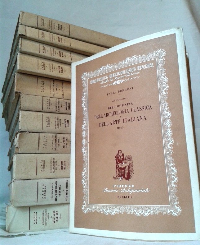 Opera in 12 volumi in 4 piccolo, brossura editoriale con sopraccoperta, titolo al piatto inquadrato ed al dorso. La pi accurata ed ampia bibliografia dell'archeologia e dell'arte in Italia. Per ogni Autore sono riportate le opere, e per ogni opera le diverse edizioni. Per citare Plinio e la sua Storia Naturale, sono elencate ben 177 edizioni, dall'Editio princeps alla pi recente. I tomi presentati si dividono in grandi sezioni, fra cui: Trattati e letteratura periegetica; Metodologia, manuali, opere generali; Congressi, convegni, cataloghi d'esposizioni e collezioni; Musei; Periodici; Viaggi nel mondo classico; Topografia; Architettura, pittura, arti plastiche, armi, oreficeria, arte vetraria, avori arredamento, numismatica, epigrafia, iconografia e tant'altro ancora. Il tomo settimo raccoglie l'indice dei luoghi d'edizione, dei tipografi, editori, calcografi, cui segue l'indice analitico, quello a soggetto, quello dei facsimili e quello generale. Nell'opera sono riprodotti ben 222 frontespizi. Le schede contengono un'accurata descrizione fisica dell'impressione citata, un sunto sommario ed i richiami bibliografici quando presenti. Complessivamente 3192 pp e 712 ulteriori di indici. Ogni volume ha doppio frontespizio inquadrato e colophon con giustificazione della tiratura (666 esemplari) e della numerazione. Difficilmente reperibile completa ed in bello stato, lamenta solo tracce di polvere e minimi difetti ad alcune sopraccoperte. Ancora intonso in grandissima parte. Essenziale.