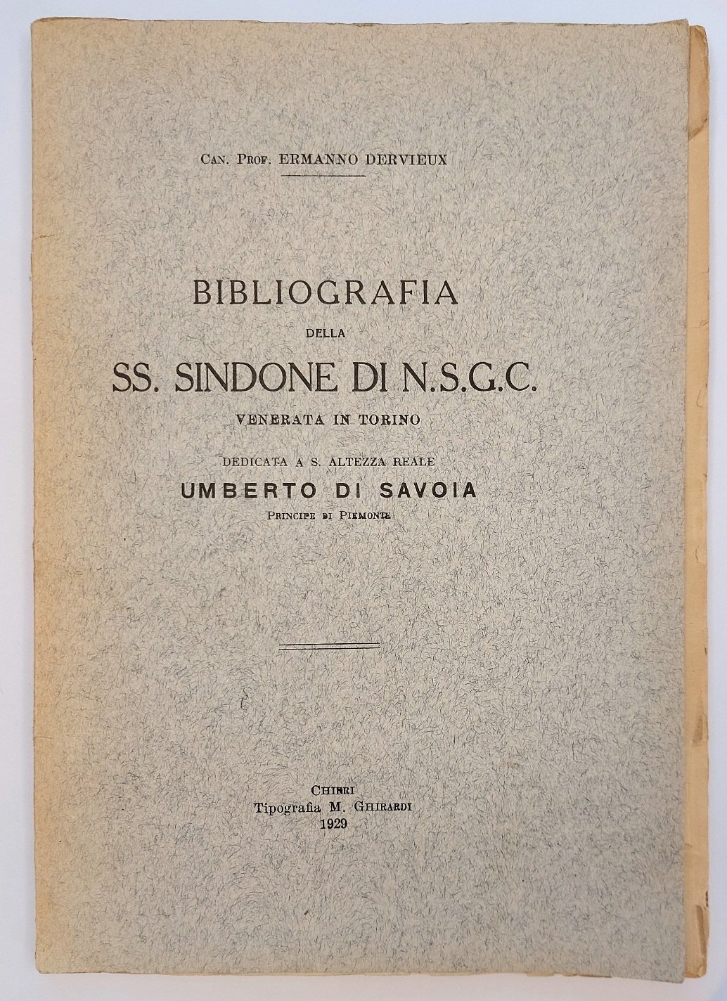 >in-8, pp. 86, (2), in fine l'Indice alfabetico (pp. 91-106, (2), broch edit. (dorso con piccolo difetto). Supplemento: pp. 91-106, (2); broch. edit. muta. Edizione originale. Registra 523 titoli relativi alla Sindone, dai primissimi testi in merito sino al XX secolo. Il Dervieux, diresse le biblioteche dei seminari di Asti e di Mondovì, e quella della Basilica di Superga. Fu poi prefetto della Biblioteca del Seminario metropolitano di Torino e contemporaneamente direttore della Biblioteca privata di Tommaso di Savoia duca di Genova. Si occupò anche di scienze naturali e fu autore di vari lavori scientifici, storici e bibliografici. E' ricordato in particolare per questa bibliografia della Sindone. Esemplare completo del Supplemento, stampato nel 1936, per aggiornare la bibliografia con con le opere impresse tra il 1929 e il 1936.