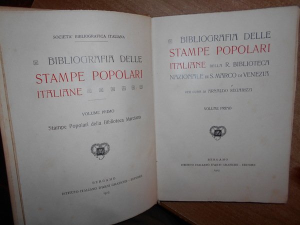 Segarizzi, Arnaldo. Bergamo, Arti Grafiche, 1913. BIBLIOGRAFIA delle Stampe Popolari Italiane della R. Biblioteca Nazionale di S. Marco di Venezia. Edizione originale. Volume primo (solo pubblicato). In-8°, cartone editoriale. 356 pp. con numerose illustrazioni nel testo. Ben conservato. Uff. B - II - 5 - 2