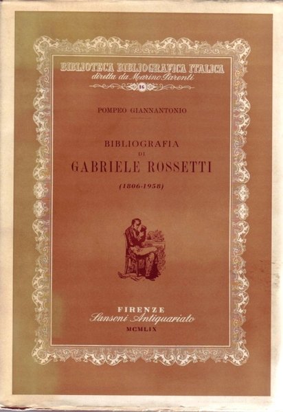 Volume in 8 grande, brossura editoriale, sovraccoperta illustrata ed inquadrata, titolo al piatto ed al dorso, bianca, occhiello, frontespizio, 251 pp., colophon con la giustificazione della tiratura (666 copie ) e della numerazione (215), bianca finale. Esaustiva bibliografia delle opere di Gabriele Rossetti, a tutt'oggi insuperata. In perfetto stato, intonsa, importante e rara.