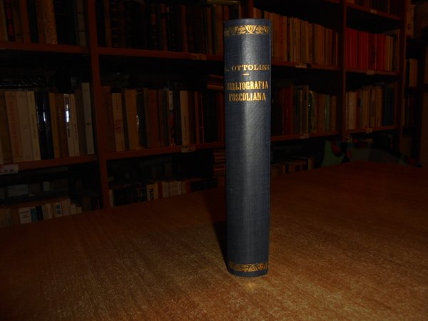 ANGELO, OTTOLINI. Firenze, (in cop.: La Nuova Italia), Luigi Battistelli, 1921. BIBLIOGRAFIA FOSCOLIANA contenente la descrizione di tutte le opere di Ugo Foscolo. con note e commenti. In-16°, tela bleu con fregi e titolo in oro al dorso, brossure originali conservate. ix, (1), 396, (4) pp. Ottimo esemplare in legatura recente con le copertine originali conservate. Uff. F - 4