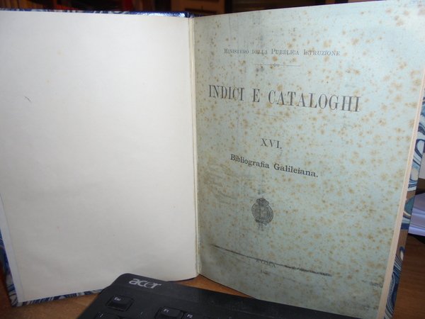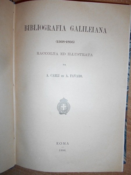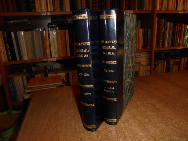 A. Carli ed A. Favaro. Giuseppe Boffito. Roma, 1896. Roma, La Libreria dello Stato, 1943. BIBLIOGRAFIA GALILEIANA 1508 - 1895 - 1896 - 1940. Supplemento alla Bibliografia Galileiana di Alarico Carli e Antonio Favaro. 2 volumi in m. pelle con fregi e titoli in oro ai dorsi, copertine originali conservate. viii, 402, (1) pp.; LII, 310 pp. In ottimo stato di conservazione un volume presenta le copertine arrossate l' altro come nuovo. Uff. D - III - 5 - 2