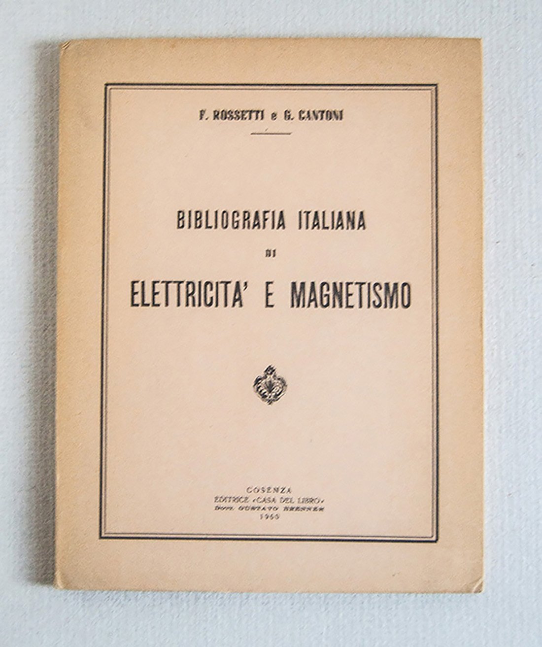 (8),117 pp. Presentato per la prima volta nel 1881 a Parigi in occasione della Mostra Internazionale di Elettricità, elenca opere di scienziati italiani (compreso le pubblicazioni anonime) sino al 1800 compreso.